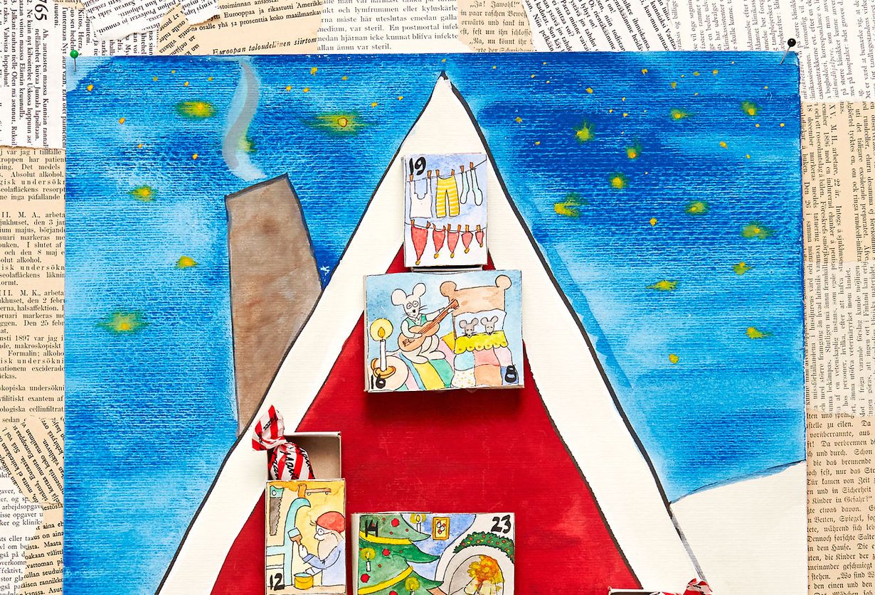 Pidä lapsenlapsen kanssa askartelutuokio, ja tehkää yhdessä joulukalenteri. Kumpikin voi piirtää lempikuviaan. Tai jos se ei innosta, liimatkaa kalenteriin valokuvia ja papereita.