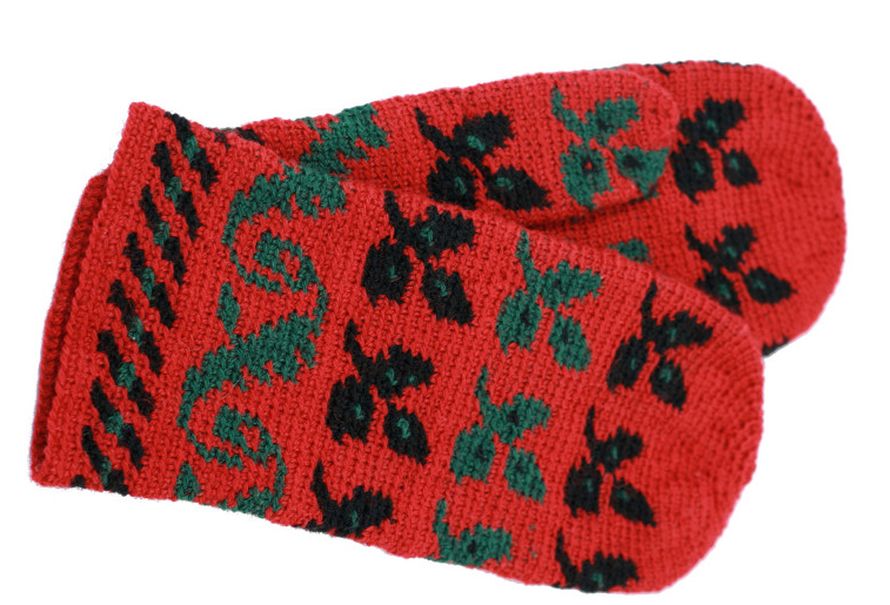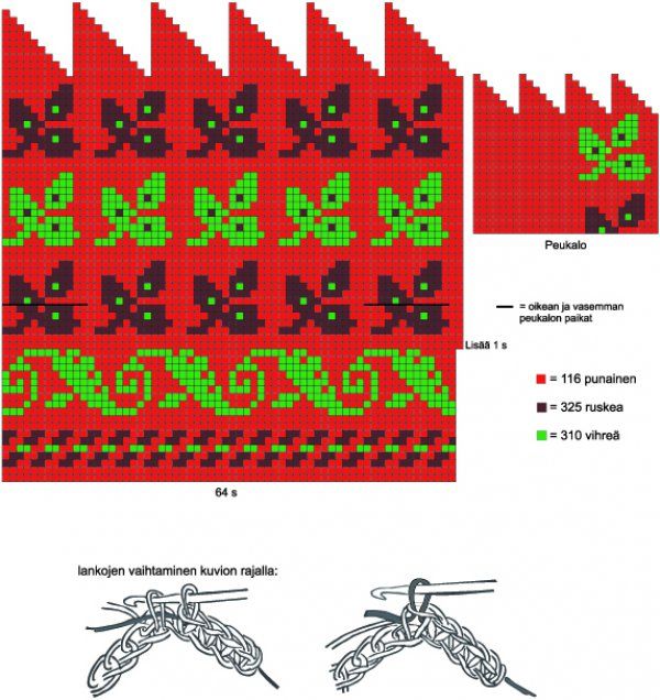 Työtä ei käännetä virkkauksen aikana, vaan uusi kerros aloitetaan aina samasta reunasta kuin työ on aloitettu ja virkataan suljettuna virkkauksena, työn oikea puoli päälläpäin. Kaikkien virkattujen rivien tulisi olla yhtä korkeita, joten yksiväristen kerrosten sisään kannattaa virkata samanvärinen ylimääräinen lanka. - Aloitus: Virkkaa punaisella 64 kjs ja sulje renkaaksi 1 kkjs. Aloita kirjovirkkaus ruutupiirroksen mukaan. Malli virkataan kiinteillä silmukoilla ja uusi silmukka virkataan aina edellisen kerroksen silmukan takareunaan. Värin vaihtuessa kuvion rajalla, viimeisen silmukan viimeinen vaihe virkataan seuraavalla värillä. Edellistä värilankaa kuljetetaan silmukoiden sisällä, jotta nurjalle ei muodostu lankajuoksuja. Katso värit ja kuviot ruutupiirroksesta. Kun olet virkannut 18 krs, lisää kerroksen 19 alussa 1 ks (= 65 ks), jotta kämmenosan kuviomalli menee tasan ja jatka kirjovirkkausta. Peukalon paikka: (katso peukalon paikat piirroksesta) Kun olet virkannut yhteensä 24 krs, virkkaa kerroksen 25 alussa 2 ks sekä 14 kjs ja hyppää edellisellä kerroksella olevien 12 ks yli. Virkkaa kerros loppuun ruutupiirroksen mukaan. Virkkaa seuraavalla kerroksella 14 ks ketjusilmukoihin ja jatka kirjovirkkausta. Kun olet virkannut yhteensä 55 kerrosta, aloita kärkikavennukset. Kavenna pois joka kerroksella 6 silmukkaa tasavälein. Kun jäljellä on enää 4 s, katkaise lanka, käännä lapanen nurinpäin ja ompele loput silmukat yhteen. Virkkaa toinen lapanen peilikuvaksi.