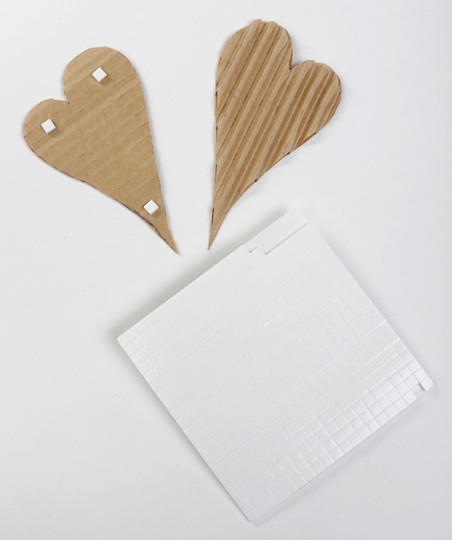 - Leikkaa aaltopahvista sydän. Kiinnitä sydämet korttiin askartelutarralla tai liimalla
