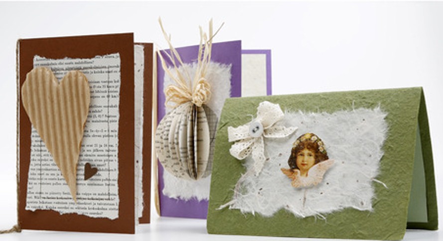 Askartele jämämateriaaleista kauniita joulukortteja. Kortteihin tarvitset vain pahvia, paperia, vanhaa pitsiä, nauhaa ja paperinpaloja.