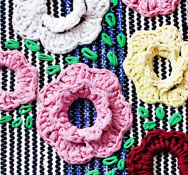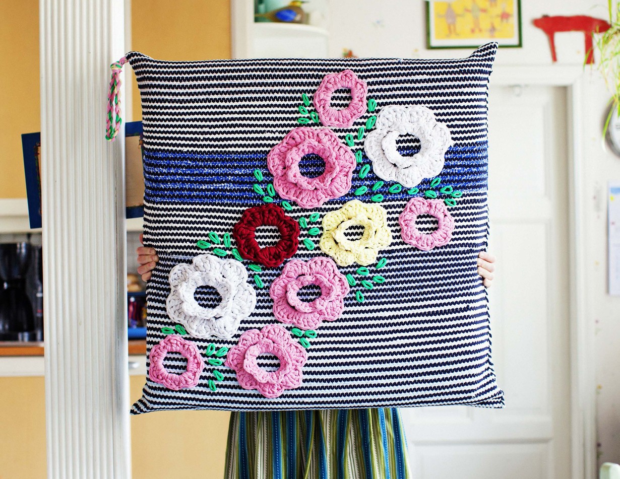 4. Virkkaa haluamasi määrä kukkia matonkuteesta ja sommittele ne tyynyn päälle. Kiinnitä kukat ulkoreunastaan kalalangalla ompelemalla. Ompele lehtiä vihreällä matonkuteella linnunsilmäpistoina kukkien lomaan suurella neulalla tai virkkuukoukulla nro 4 kudetta maton läpi vetäen.