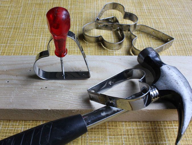 1. Tee naskalin avulla reiät sydänmuottien kärkeen molemmille puolelle sekä noin puoliväliin muotteja. Käytä pöydän suojana lautaa, johon naskali voi upota huoletta. Voit halutessasi mitata reikien paikat ja merkitä ne ensin tussilla. Napauta vasaralla ja naskalilla reiät muotteihin. Tee kaksi reikää muotin kärkeen ja kaksi puolivälin paikkeille.