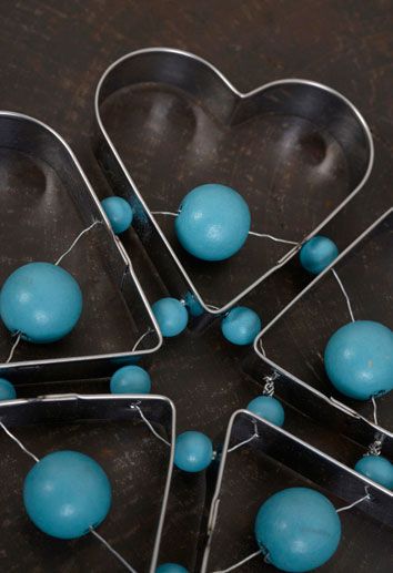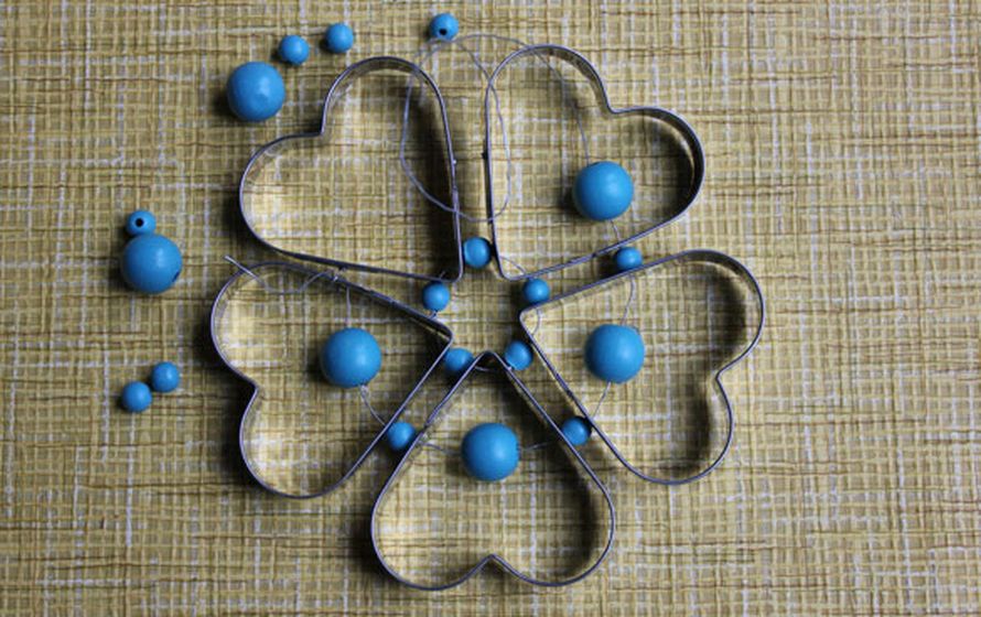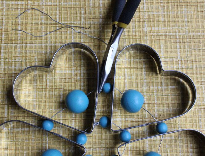 Sydämenmallisista piparimuoteista ja puuhelmistä syntyy metallilangan avulla kukkaa muistuttava alunen.