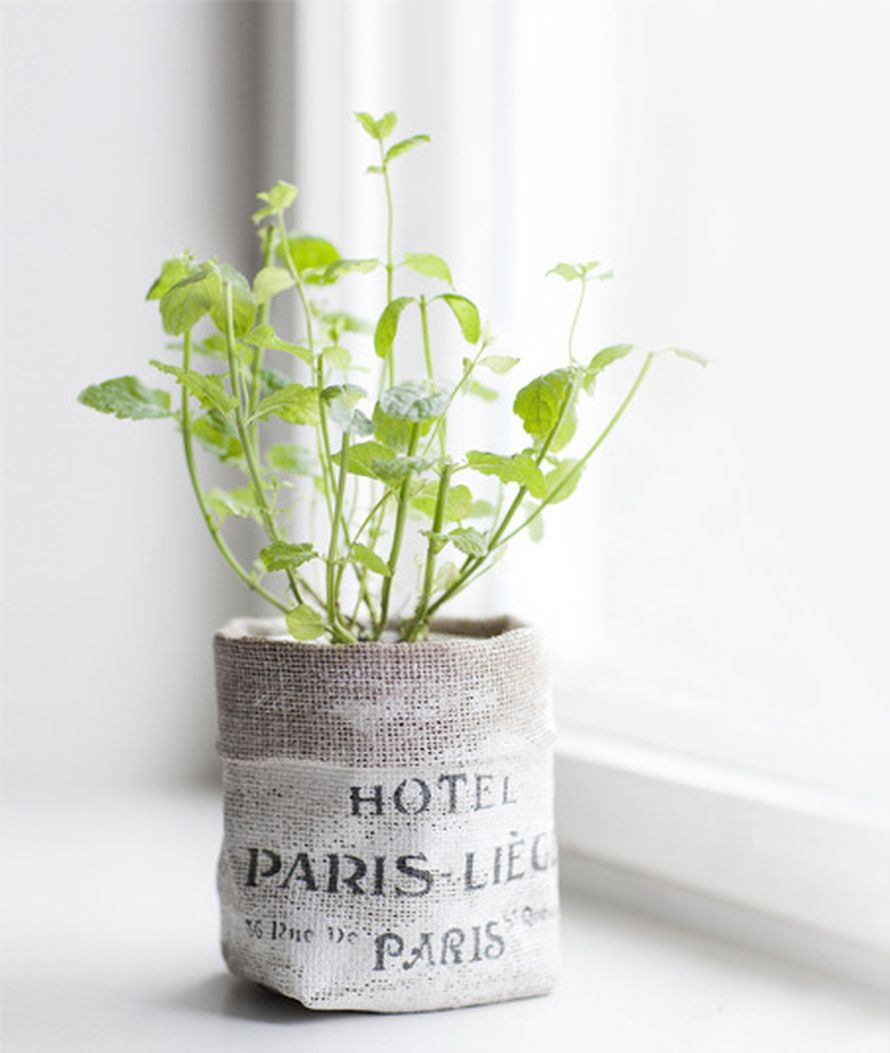 Maalattu juuttikangas on kaunis ruukunsuojus.