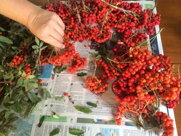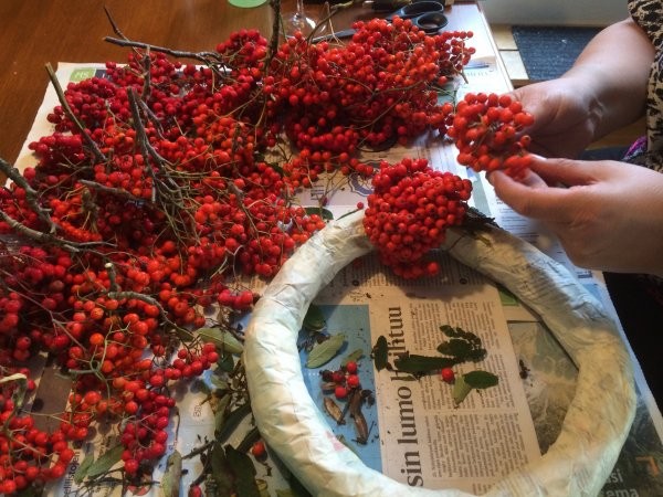 Komean kranssin kasaaminen on melko raskasta hommaa, sillä pihlajanmarjatertut pitää kiinnittää napakasti rautalangalla. Mutta tulos on aivan ihana!