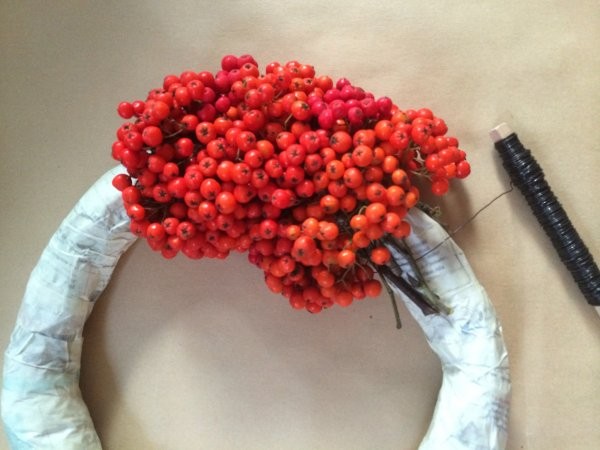 4. Ala sitoa pihlajanmarjaterttuja. Aseta pari kolme pihlajanmarjaterttua vierekkäin pohjakranssin päälle ja sivuille varret samaan suuntaan. Sido tertut napakasti varsistaan metallisella sidontalangalla pohjakranssin ympäri kiertäen.