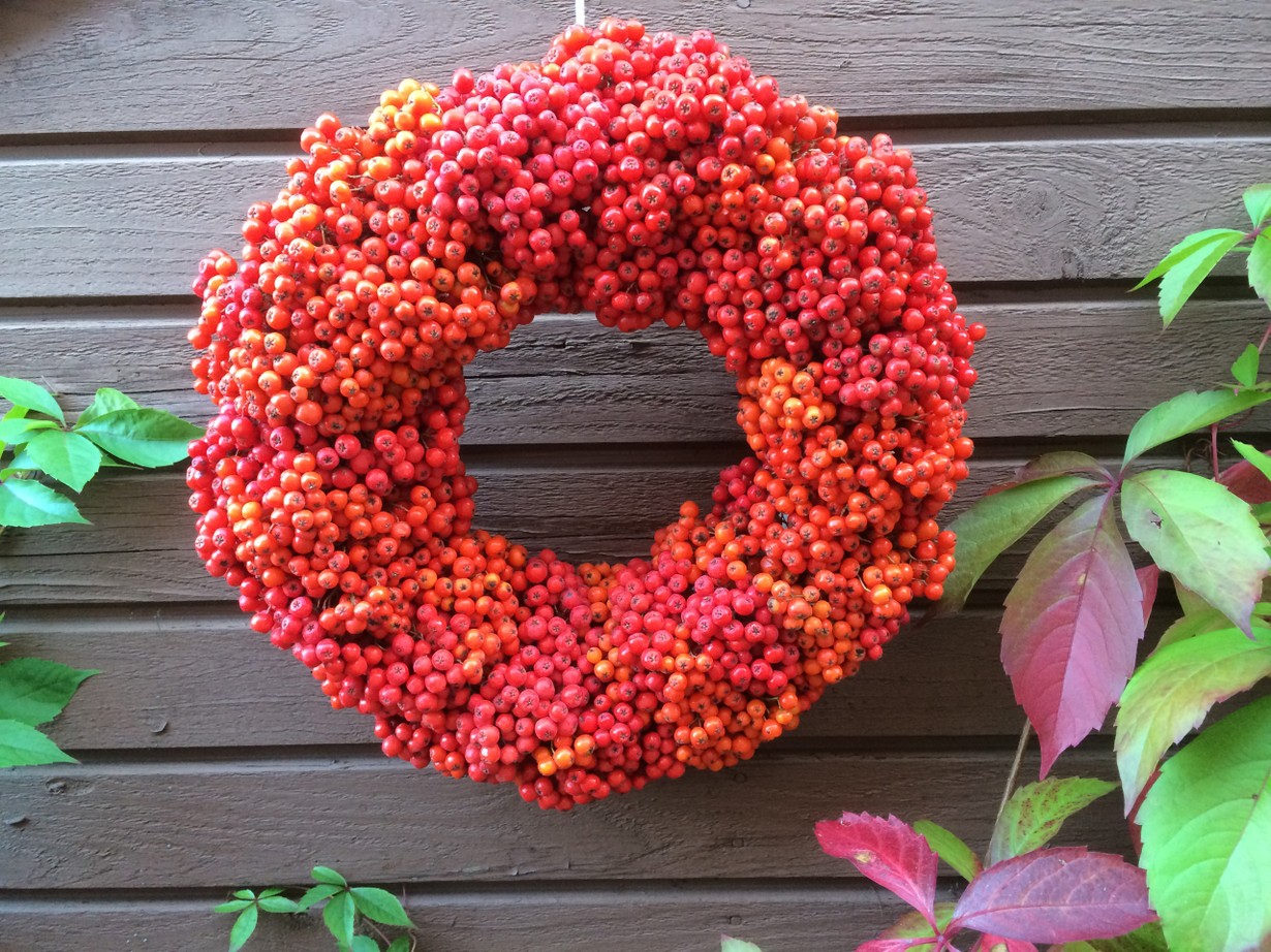 Valmiin pihlajanmarjakranssin halkaisija on 38 cm.