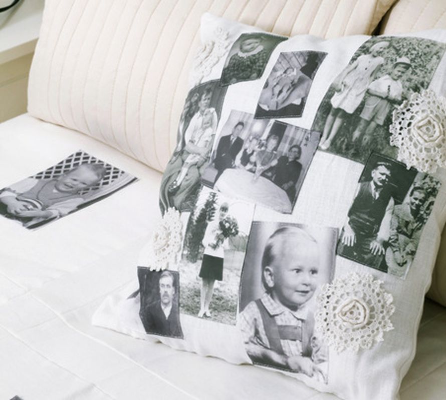 Vanhoista valokuvista saa persoonallisia tyynyjä, kasseja tai essuja. Kuvien tulostaminen kankaalle on helppoa kotonakin.