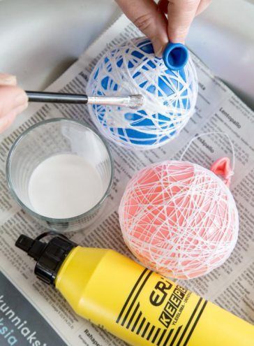 - Sekoita purkissa 2/3 Erikeeperiä ja 1/3 vettä. Solmi pallon kantaan pitkä naru ja sivele liimaseosta koko pallon pintaan. Ripusta pallo kuivumaan narusta ja suojaa alusta lehdellä. Anna kuivua vuorokausi tai kunnes pallo on kova.
