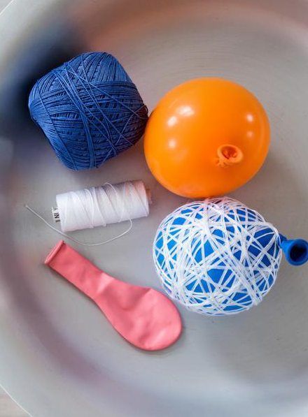 - Puhalla pieni ilmapallo täyteen, solmi napakaksi. Kiepauta lankaa ristiin rastiin pallon yli melko tiheäksi lankapinnaksi ja pujota langanpää toisten lankojen alle.
