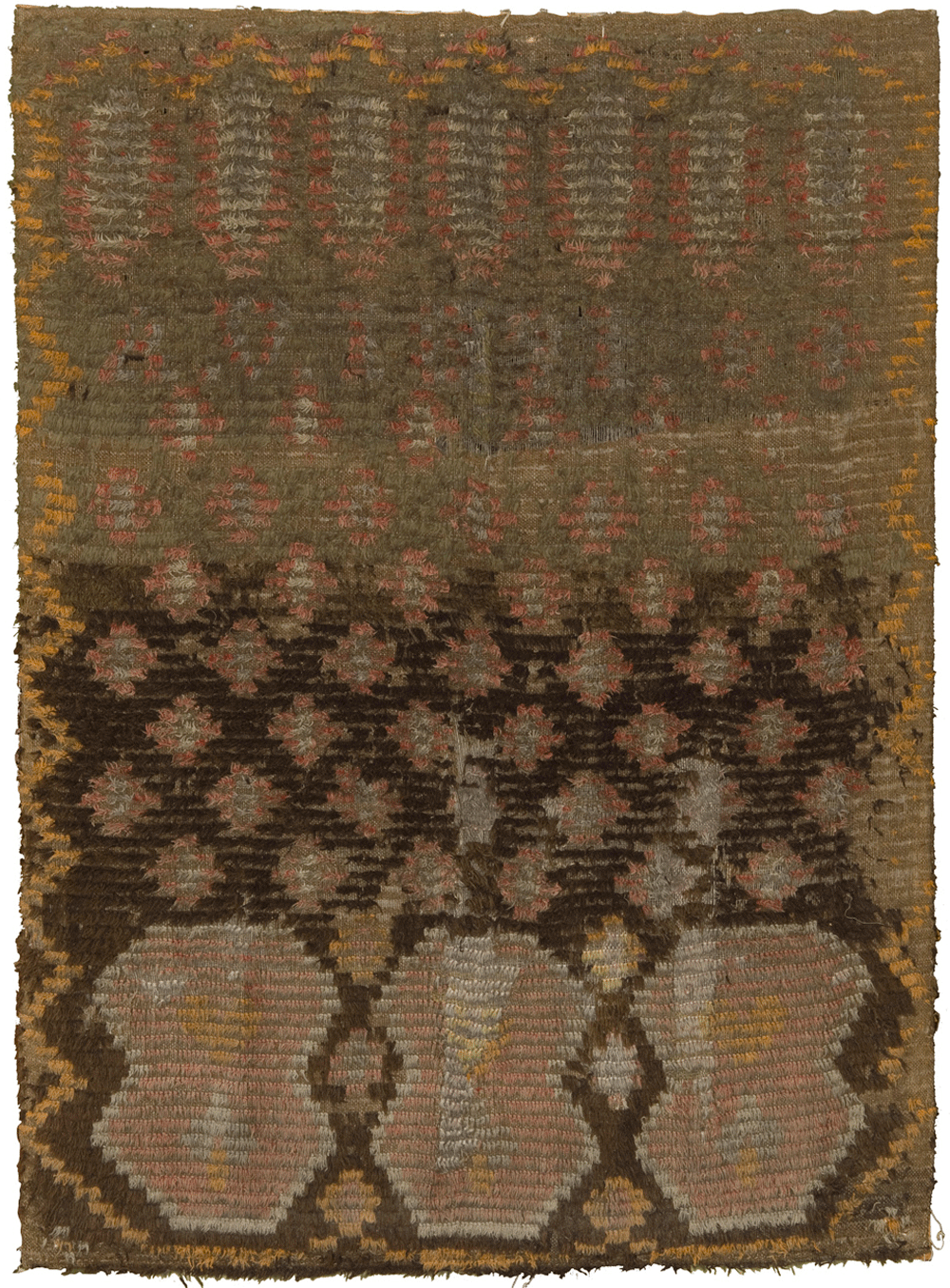 Vuonna 1891 tehty ryijy on tumma, osin kulunut ja paikattu.