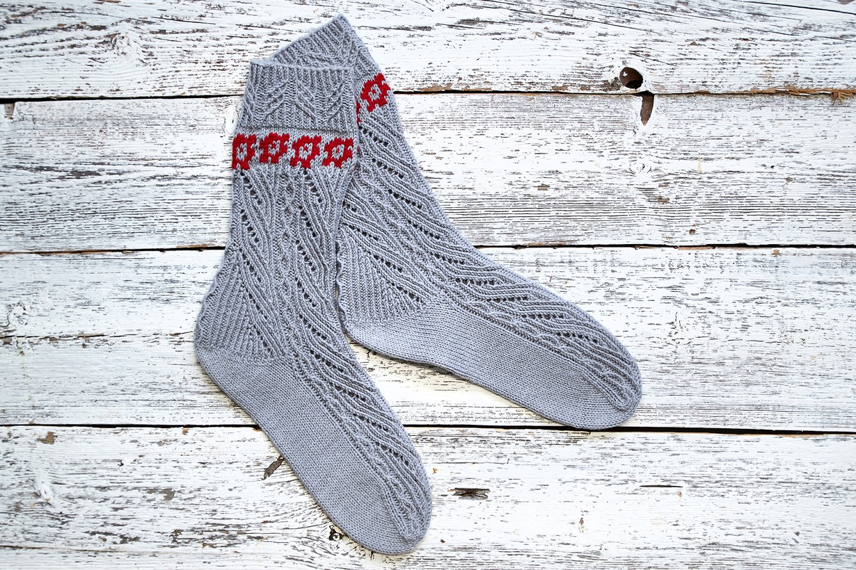 – Löysin mallineuleen, joka sopi aikomaani silmukkamäärään. Kotoa löytyi sopivasti malliin sopiva syksyisen harmaa lankakerä. Halusin sukkiin myös väriä. Kirjoneulekukkaset ovat osa vanhan latvialaisen lapasmallin isompaa kukkakuviota. Harmaa lanka on Opal ja punainen Arwetta, neulottu pyöröpuikoilla 2.25.