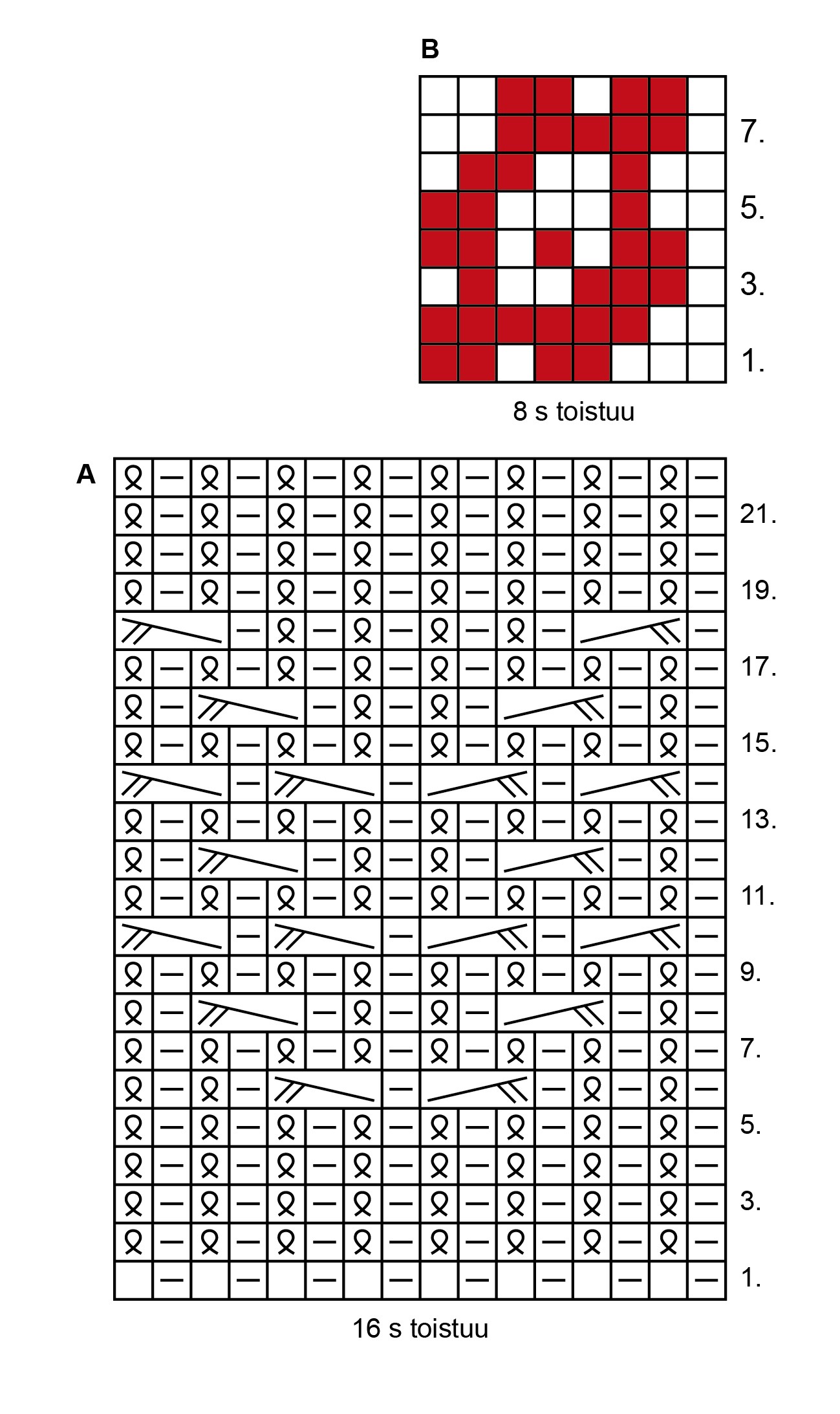 Luo pohjavärillä paksummille puikoille 64 s ja jaa ne 4:lle puikolle (= 16 s/puikko). Neulo pintaneuletta ruutupiirroksen A mukaan 22 krs. Neulo sileää neuletta 2 krs, kirjoneuletta piirroksen B mukaan 8 krs ja sileää neuletta 2 krs.