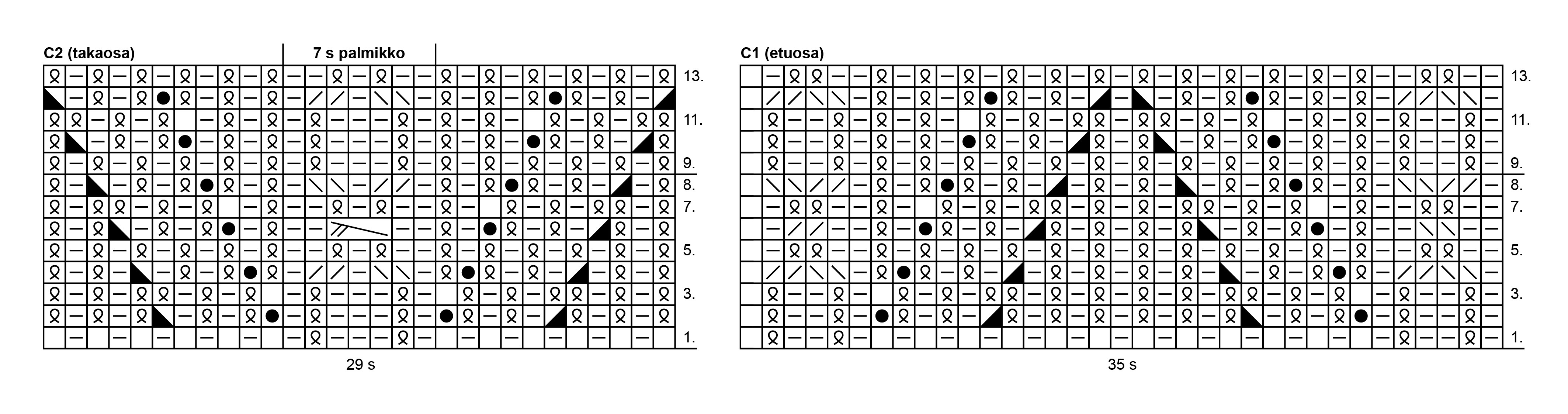 Vaihda ohuemmat puikot, neulo seuraavalla krs:lla 7 o ja jaa s:t uudelleen puikoille näin: 18-17-17-12 s. Sukan edessä (1.-2. puikoilla) on nyt 35 s ja takana (3.-4. puikoilla) 29 s. Neulo edessä pitsineuletta piirroksen C1 ja takana piirroksen C2 mukaan. Neulo ensin piirrosten 1.-13. krs:t mutta toista palmikoissa samalla 1.-8. krs:ia. Toista sitten 2.-13. krs:t ja neulo lopuksi vielä 2.-9. krs:t.