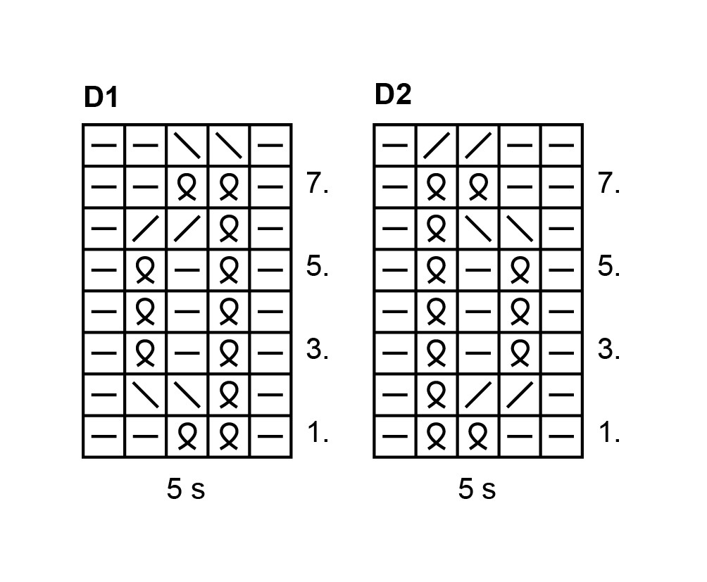 Aloita sitten teräosan neulominen näin: Jatka edessä pitsineuletta siitä mihin jäit ennen kantapäätä mutta neulo nyt palmikot piirrosten D1 ja D2 mukaan (= 5 s/palmikko). Neulo sukan pohjassa sileää neuletta ja tee viimeinen kantapään kavennus neulomalla edellisen käännöskohdan molemmin puolin olevat s:t 2 o yht. Kavenna vielä terän sivuilla joka 2. krs näin: tee sileän neuleen alussa yvk ja kavenna sen lopussa 2 o yht. kunnes pohjassa on 31 s sileää neuletta ja edessä 33 s. Jatka sitten edessä pitsineuletta ruutupiirroksen C1 mukaan, tee sen molemmilla puolilla 5 s:n palmikoita ja neulo pohjassa sileää neuletta.