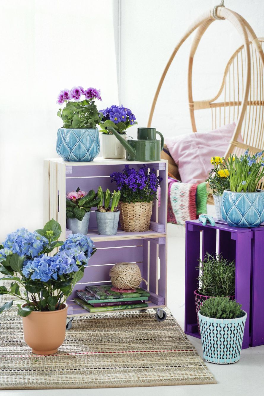 Kokoa kevyeen hyllykköön kaunis ruukkupuutarha! Täytä hylly kesäkukilla, yrteillä tai vaikkapa puutarhakirjoilla. Voit myös maalata yksittäisen laatikon kalustemaalilla ja nostaa sen pystyyn kukkapöydäksi.