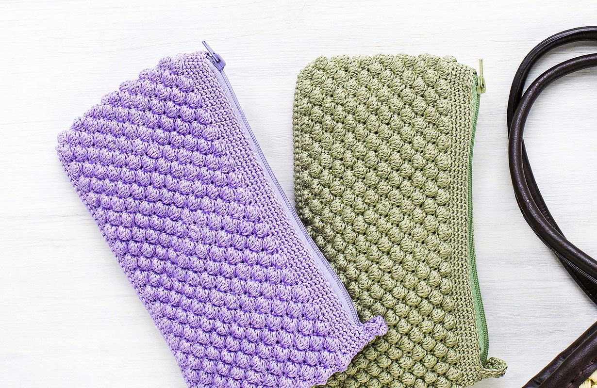 Virkattu pikkulaukku muuttaa ilmettään langan mukaan. Hillitystä langasta tulee tyylikäs teatteripussukka, räväkästä hauska kynäkotelo lapsenlapselle. Hauskat pampulat tekevät yksinkertaisen ja helpon pussukan pinnasta eläväisen näköisen.