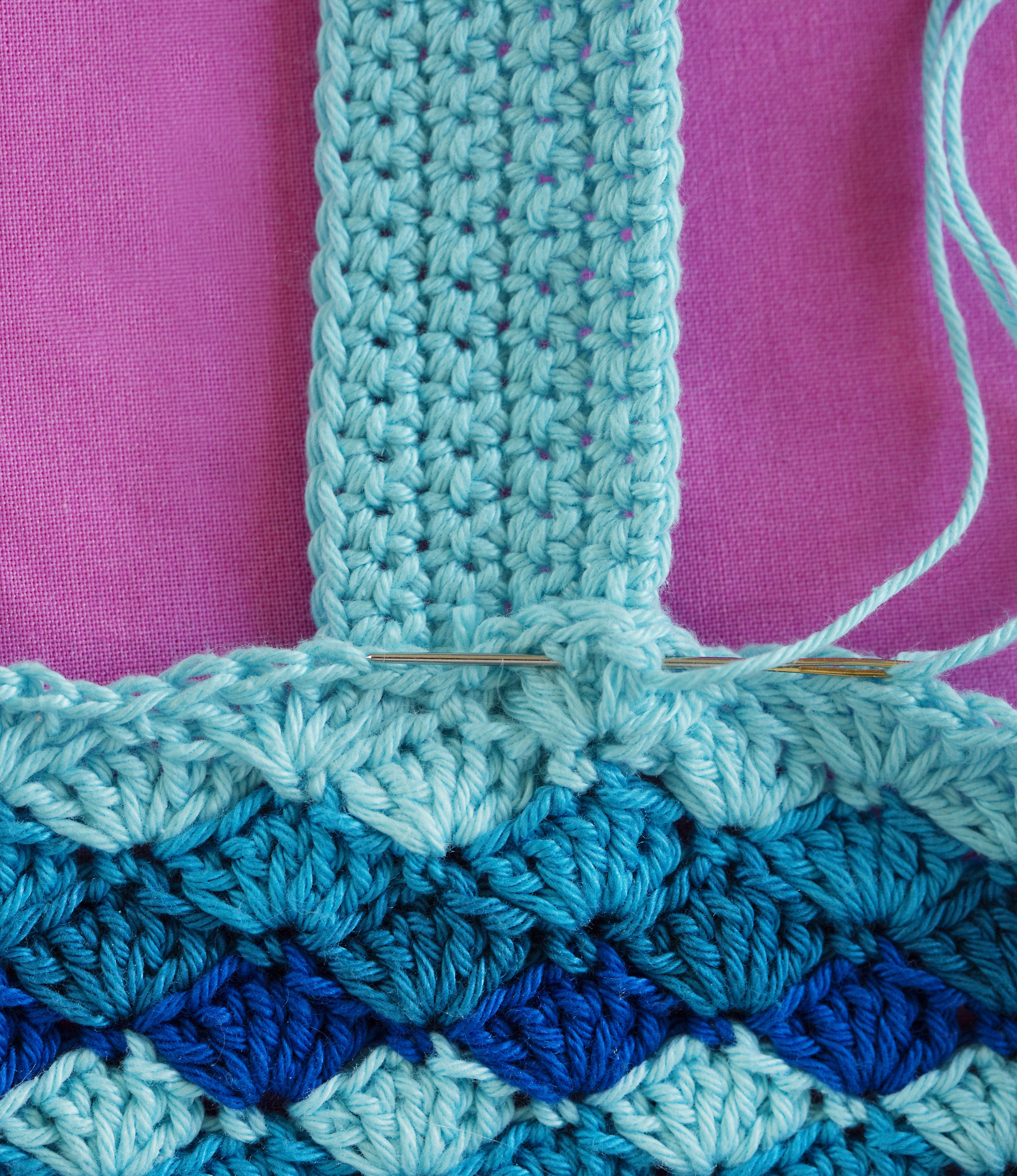 4. Virkkaa kahvaa varten 140 krs ja virkkaa 8 krs ks, käänny reunoissa 1 kjs:lla. Ompele kahva päistään kassin toiselle sivulle turkoosiin raitaan nurjalle ja noin 15 cm:n päähän toisistaan. Ompele lopuksi oikealta muutama pisto pitämään kahvoja suorassa.