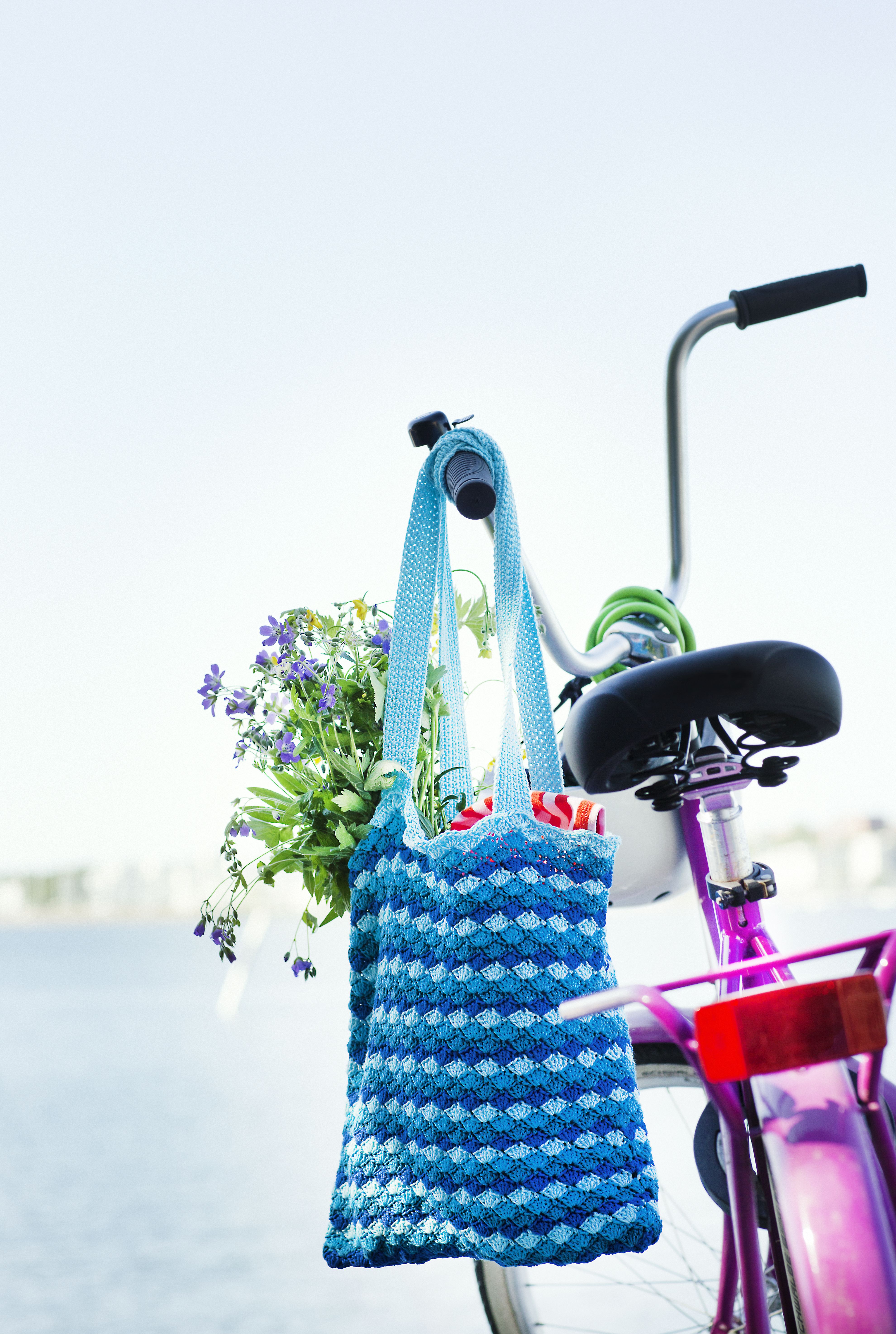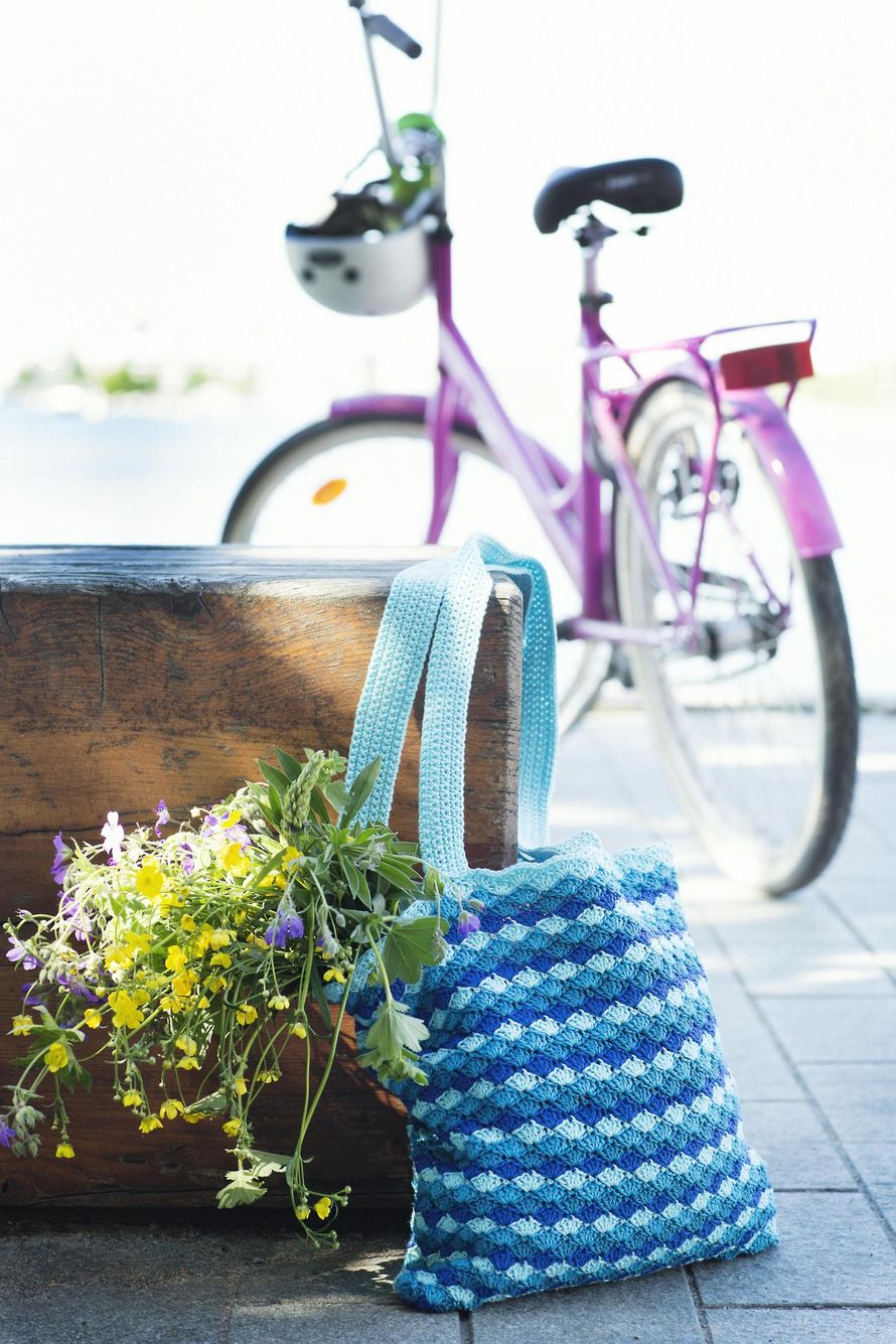 Virkkaa kesän pirtein kassi puuvillalangasta helppoa simpukkavirkkausta. Valitse suosikkisävysi ja istahda laiturin nokkaan virkkaamaan.