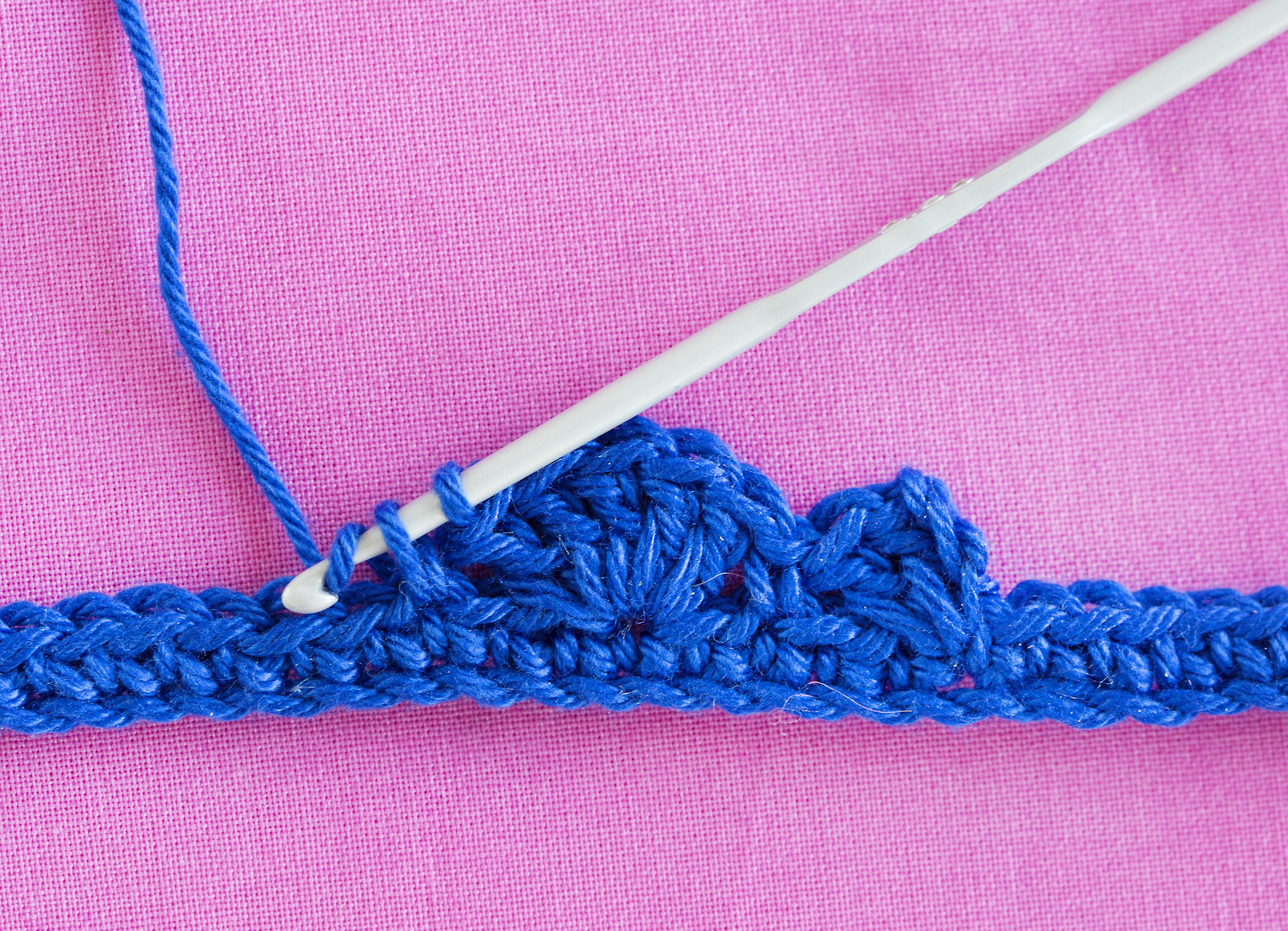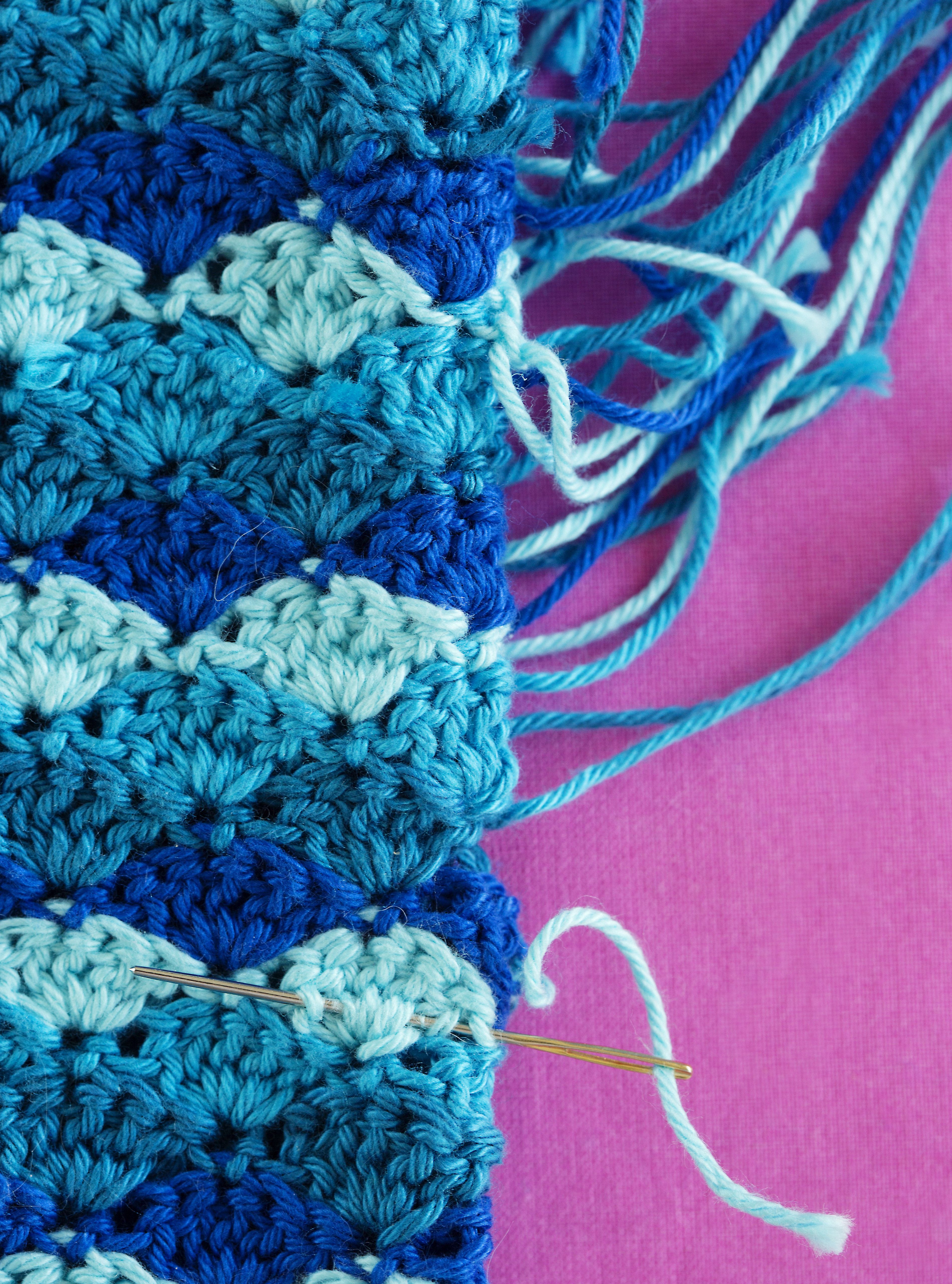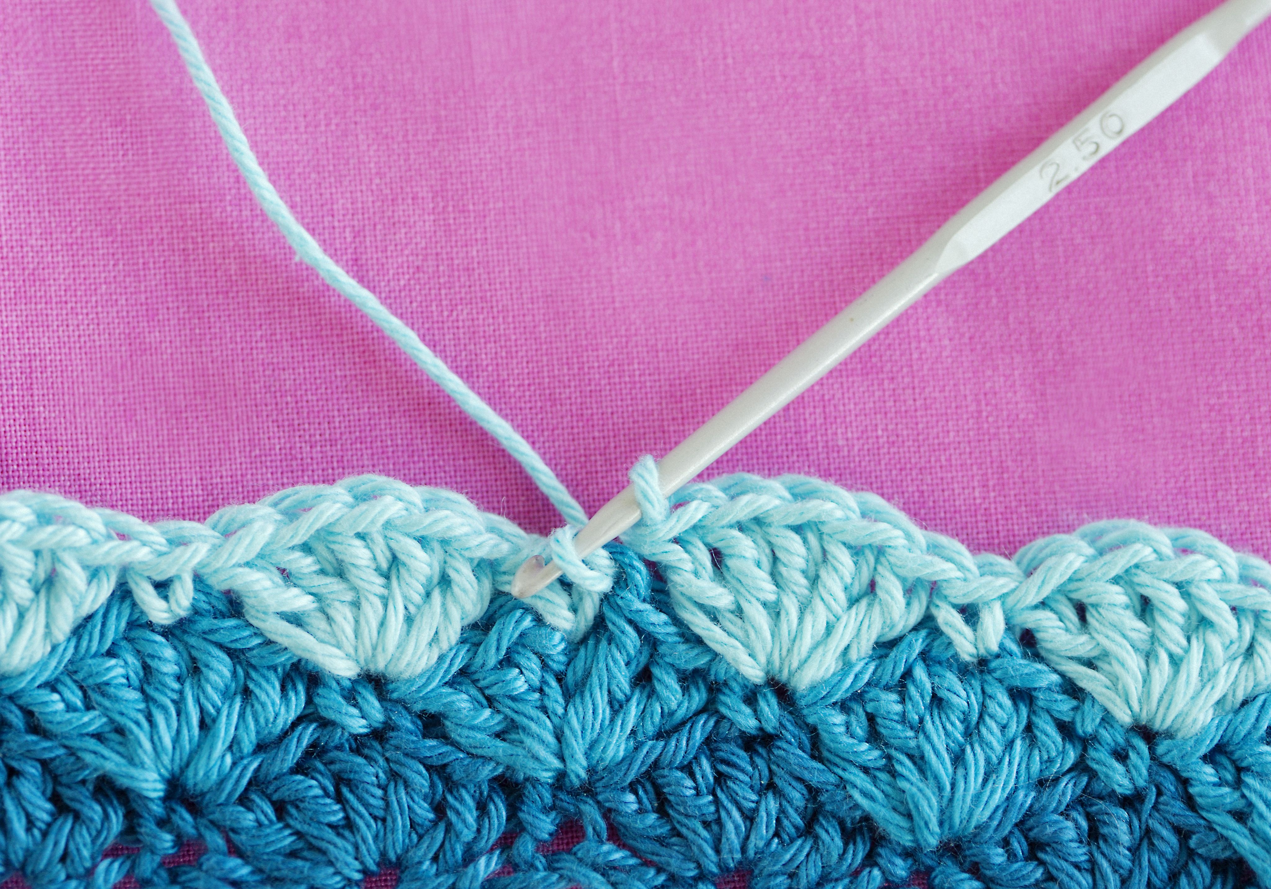 1. Luo 150 kjs, sulje krs 1 ps:lla ensimmäiseen kjs:aan. Aloita sitten virkkaus vaihtaen väriä joka kerros, jos haluat aaltomaisen raidallisen lopputuloksen. Virkkaa 1 krs ks ja sulje krs 1 ps:lla. Virkkaa simpukoita tummansinisellä: 3 kjs (= 1.p) 2 p allaolevaan ks:aan, jätä 2 ks väliin, *1 ks seuraavaan s:aan, jätä 2 ks väliin, 5 p seuraavaan s:aan, jätä 2 ks väliin*, toista * – * yhteensä 25 kertaa ja lopeta virkkaamalla 2 p alun ks:aan, sulje krs 1 ps:lla.