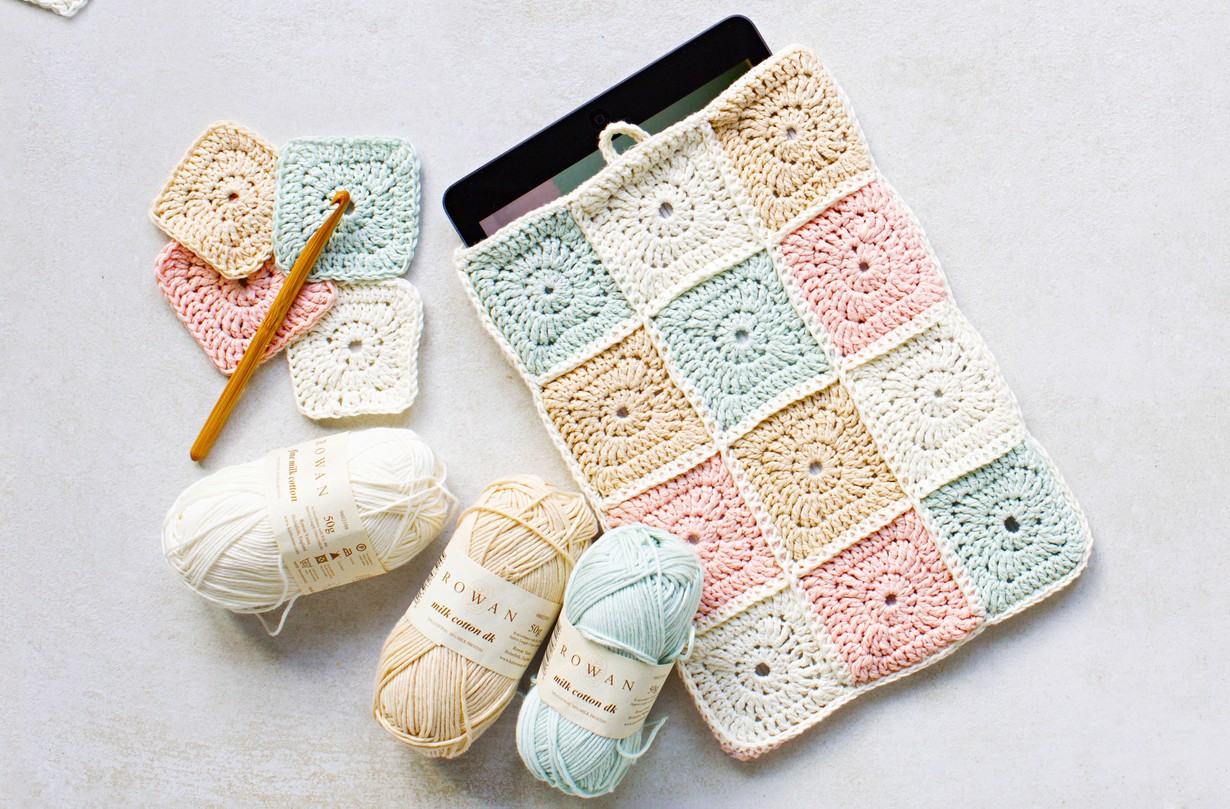 Tabletti kulkee kolhiintumatta kassissa, kun sen sujauttaa nättiin paloista virkattuun pussukkaan.