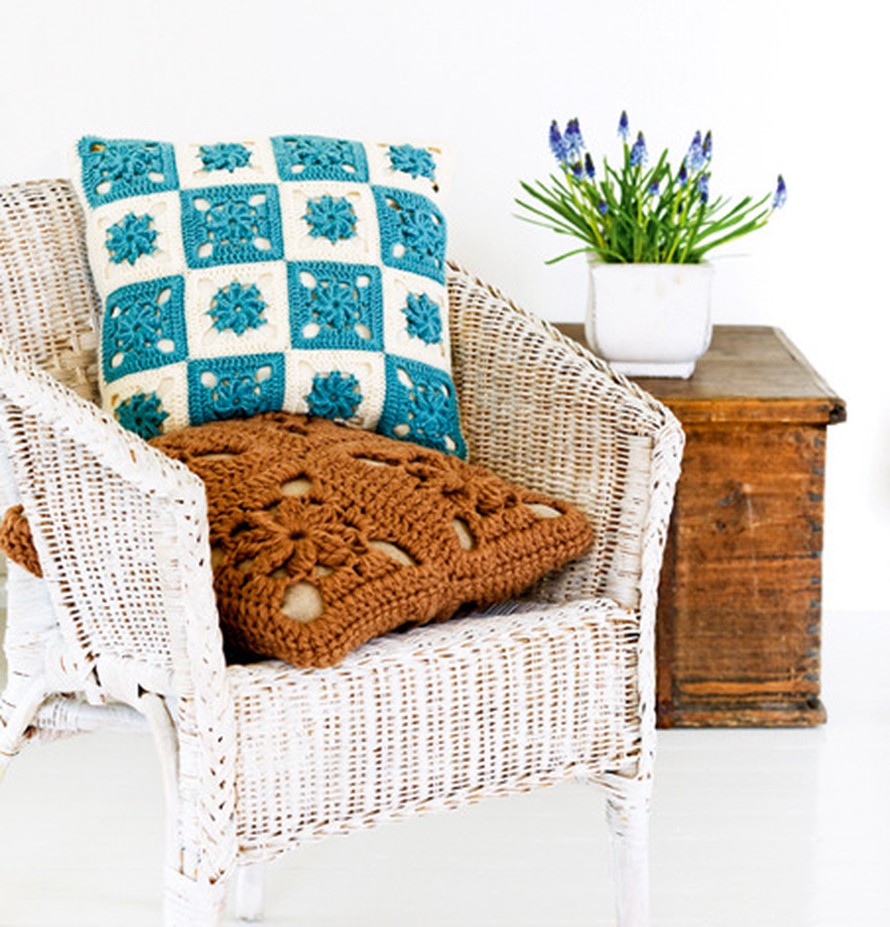 Idea! Jos haluat värikkään tyynyn, virkkaa lankojen lopuilla vaikka kaikki palat erivärisiksi. Pehmeällä villalangalla virkatuista ruuduista voit koota suloisen torkkuhuovan – tee peiton kooksi esimerkiksi 120 cm x 160 cm.