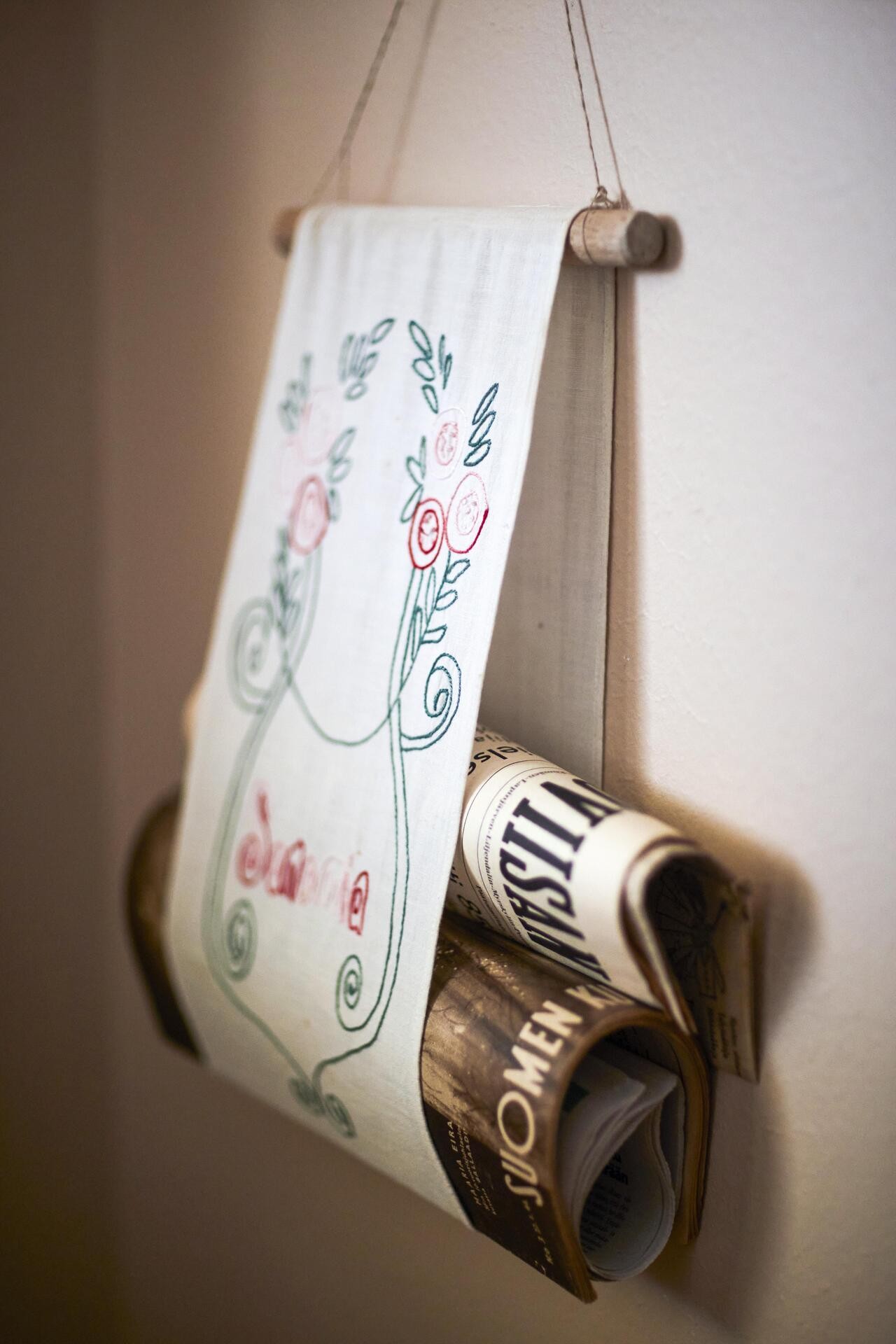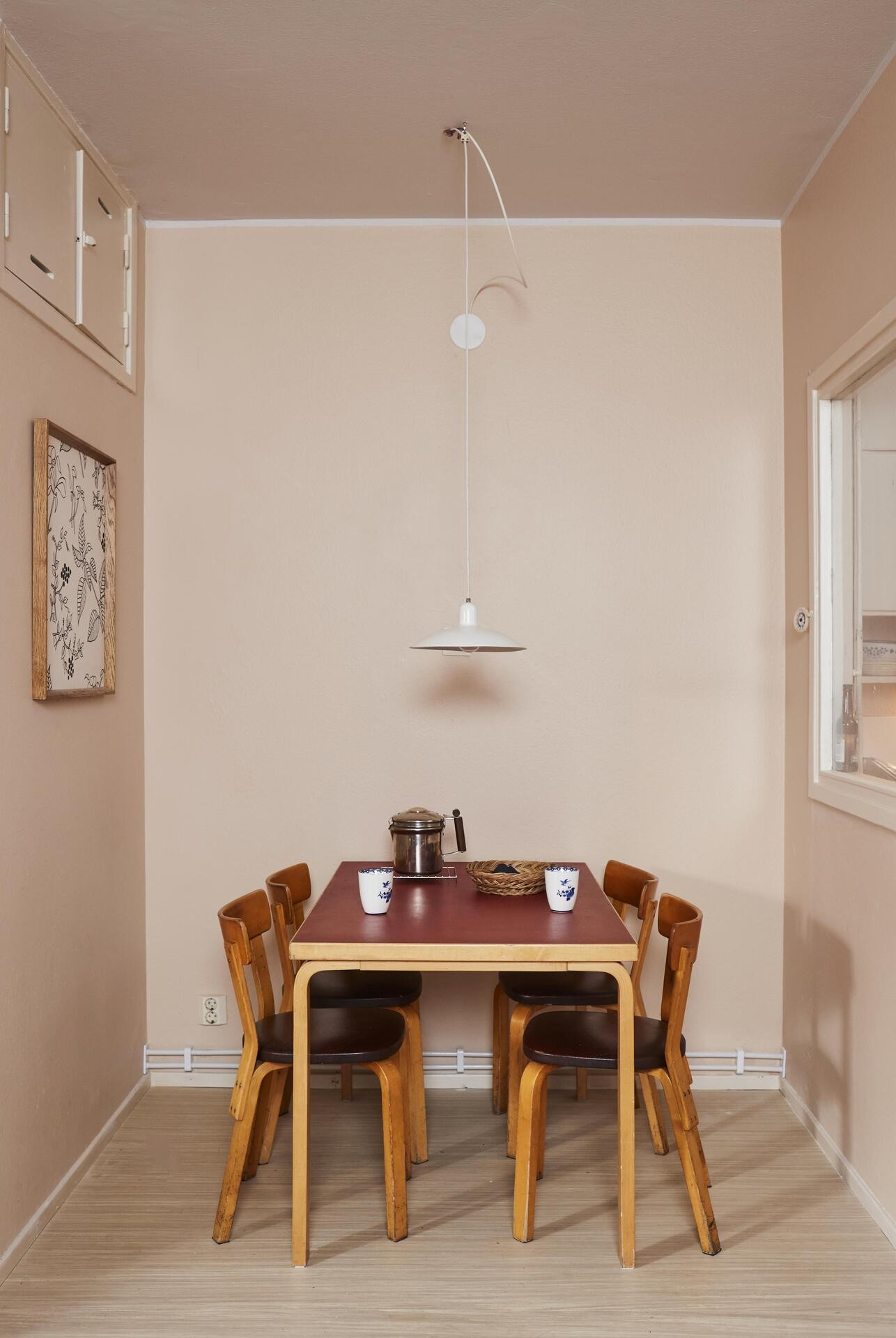 – Sisustimme asunnon 1940-luvun työläisasunnoksi. Kalusteet on peritty, saatu tai hankittu halvalla. Nojatuolit ja kattolamppu ovat anopilta, sohvapöytä ja Artekin ruokapöytä kavereilta. Artekin tuolit löysin ravintolan konkurssipesästä, Eric kertoo.