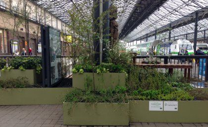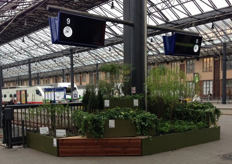 Yllättävän korkeat tunturikoivut kurottavat Helsingin rautatieaseman lasikattoa kohden. Niiden juurella kukkivat herkät atsaleat ja hortensiat. Jos junasi saapuu laitureille 4–11, saavut suoraan Ihmepuutarhaan.
