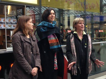 Puutarhan suunnitteluun osallistuneet Pauliina Melander, Maria Wallin ja opettaja Maarit Haapamäki.