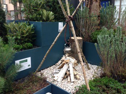 – Opiskelijat ovat rakentaneet istutukset osioihin, jotka hehkuvat eri vuodenaikojen sävyissä. Suomalaisuus tulee esille paitsi kasveissa myös somistuksessa: mukana on niin koivikko, laituri, nuotio kuin rautakautinen kuppikivi eli uhrauspaikkakin, kertoo opiskelijaryhmää luotsaava opettaja Maarit Haapamäki.