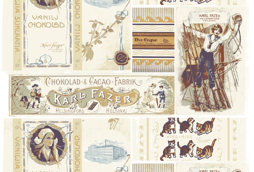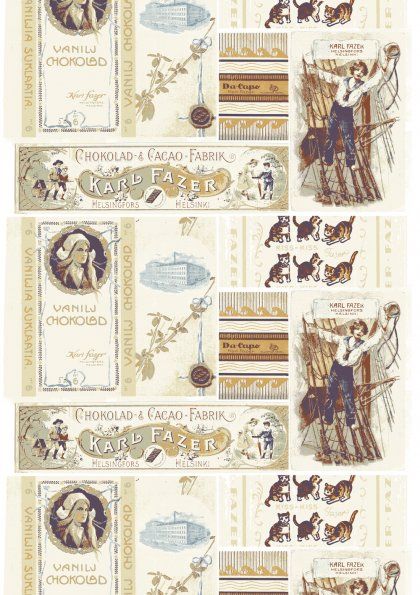 Pian myös Vallila Interiorin sisustuskankaassa. Vallilan Nostalgia-sarja käynnistyi suositusta Jaffa-kuosista ja nyt on siis edetty Kettukarkkien kautta suklaaseen. Da Capon kanssa samassa Cacao fabrik -kankaassa seikkailee myös makeistehtaan julisteita 1900-luvun alkuvuosilta.