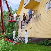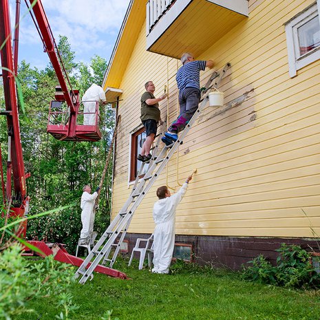 – Perhe käy mökillä vain kuusi kertaa vuodessa. Äitini on luonut hyvät suhteet naapurissa hääriviin rakennusmiehiin. Heiltä jää usein maalia tai kattopeltiä, ja ruokapalkalla he ovat korjanneet meidänkin vaatimatonta mökkiämme. Pari vuotta sitten he tekivät jopa uuden katon jämämateriaalista.