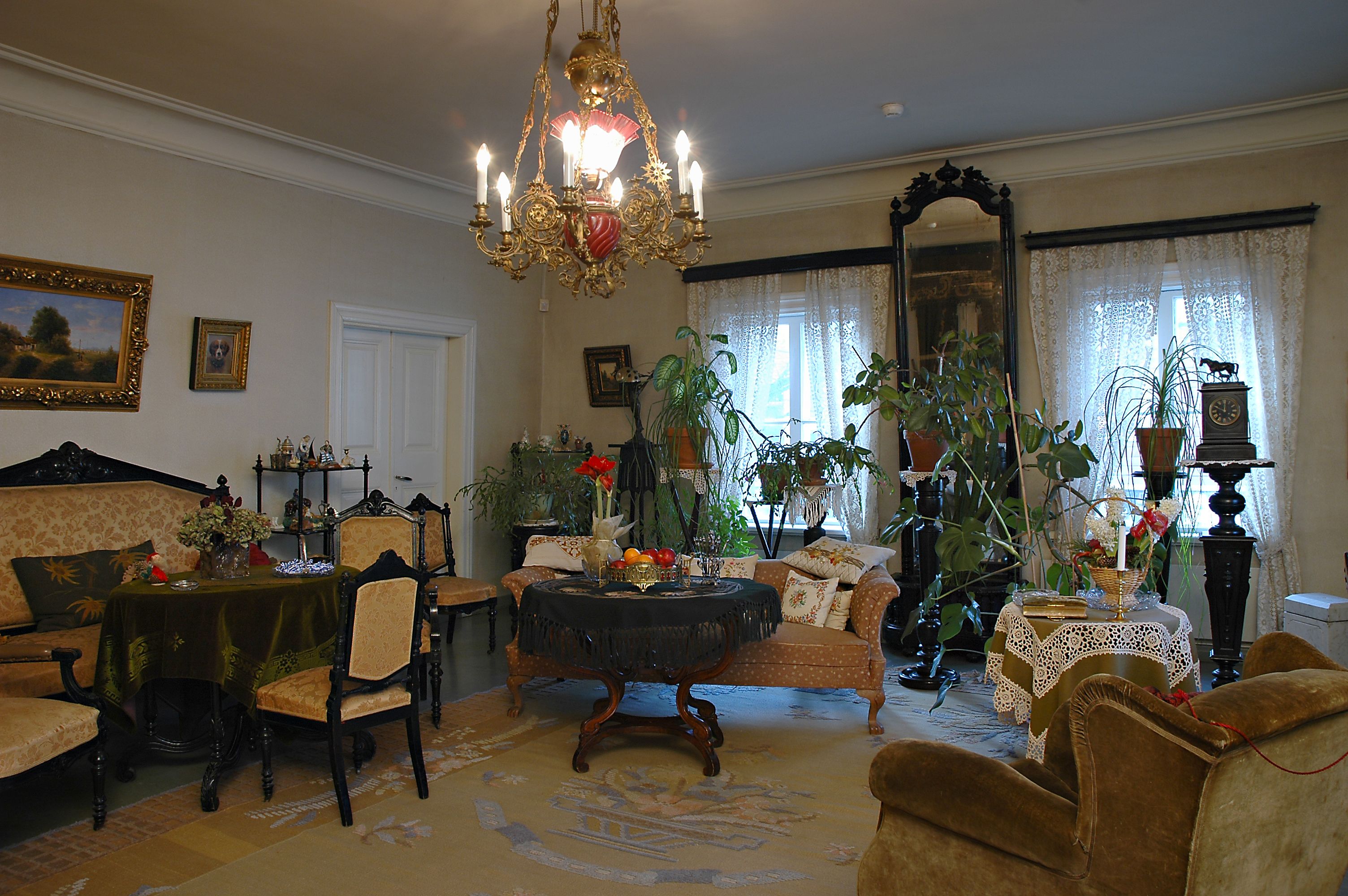Koristeita on kaikkialla. Jotkut niistä ovat yli sadan vuoden ikäisiä, toiset on tety muutama vuosikymmen sitten. Talosta ei koskaan hävitetty mitään, koska kaikelle saattoi olla käyttöä myöhemmin. Takanraunuksilla, pöydillä ja ikkunoilla voi olla vierekkäin suupuhallettu lasikoriste 1900, ja muovinen koriste Hongkongista vuodelta 1970.