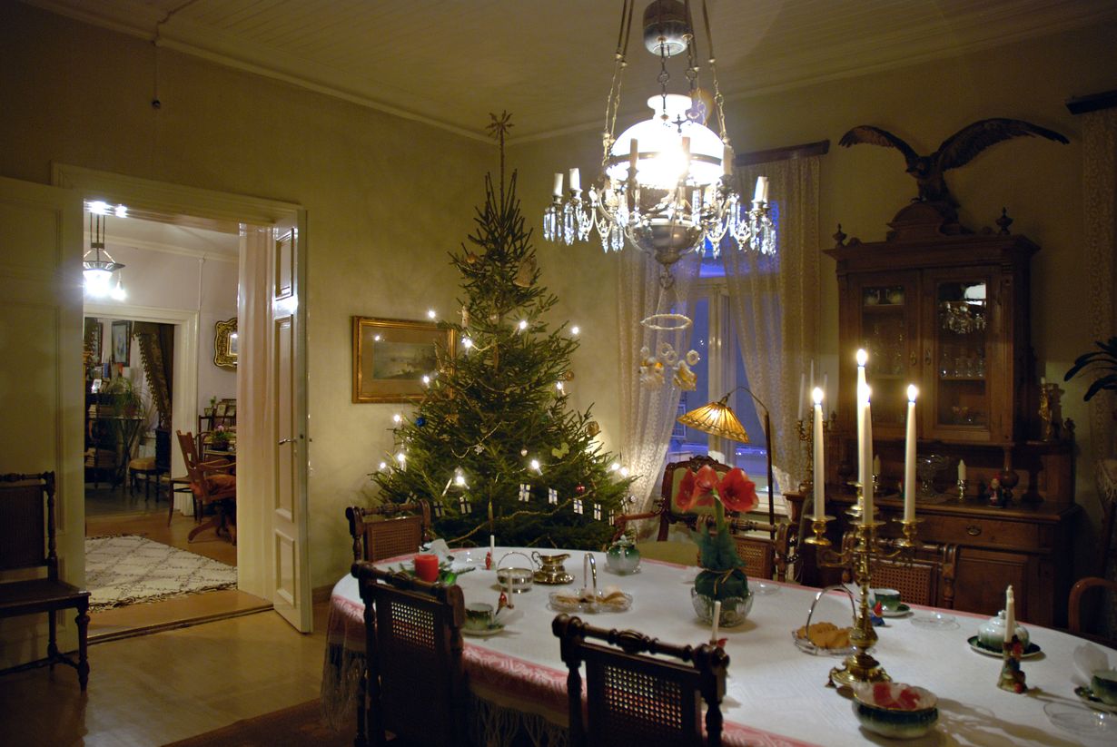 Ruokasaliin tuodaan kattoon asti ulottuva kuusi, jonka vanhimmat koristeet, pukki ja enkeli, ovat olleet käytössä jo 1900-luvun alussa. Juhlavassa ruokapöydässä kimaltelevat juhlaa varten esiin otetut astiat, ja jokaisen perheenjäsenen paikkaa koristaa oma tonttunsa. Joulukukat, omenat ja pähkinät tuovat taloon tuoksuaan. Tunnelma talossa on hiljainen ja rauhallinen, ja siellä voi hetkeksi unohtaa joulun kiireet ja hyörinän.