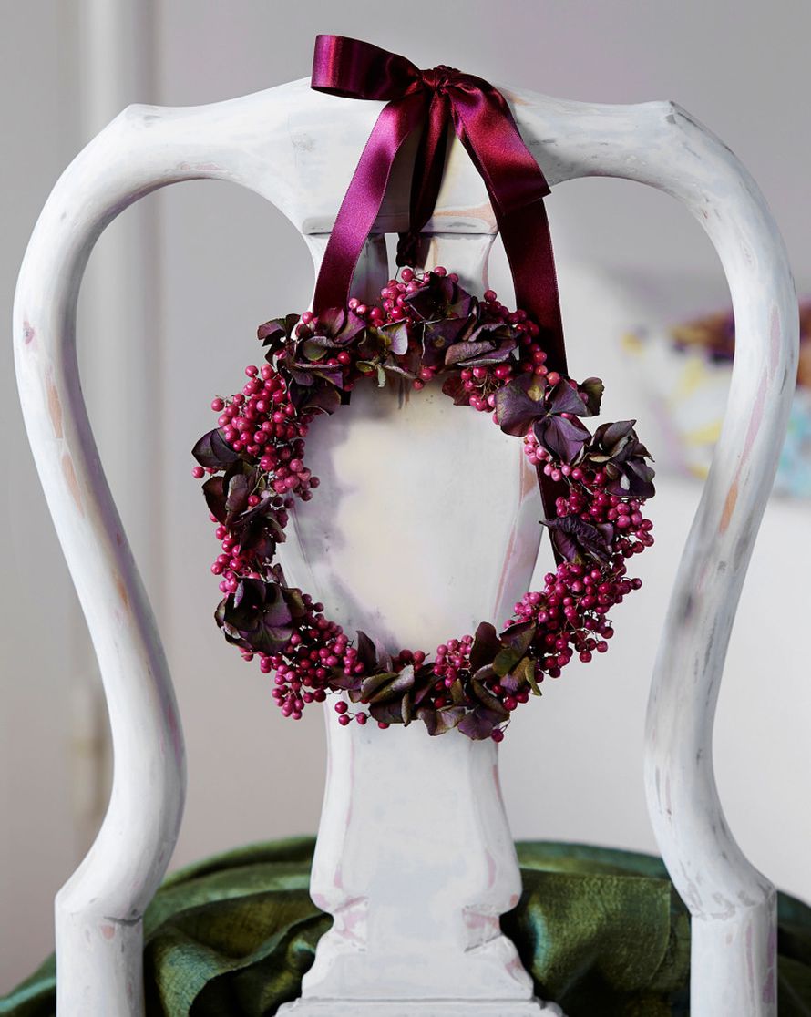 Ruokapöydän tuoli ansaitsee juhla-asun. Silkkinauhalla selkänojaan solmittu seppele on taivuteltu pippurinmarjoista ja hortensian kukinnoista.