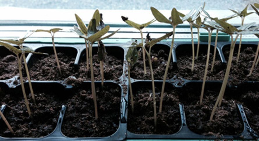 Jotkut siemenet itävät vain pimeässä, mutta yksikään taimi ei kasva liian vähässä valossa. Siirrä taimet loistelampun tai kasvivalon alle tai valoon ikkunalaudalle. Varo kuitenkin suoraa auringonpaahdetta! Vaalea väri voi johtua myös typen puutteesta. Lannoita.