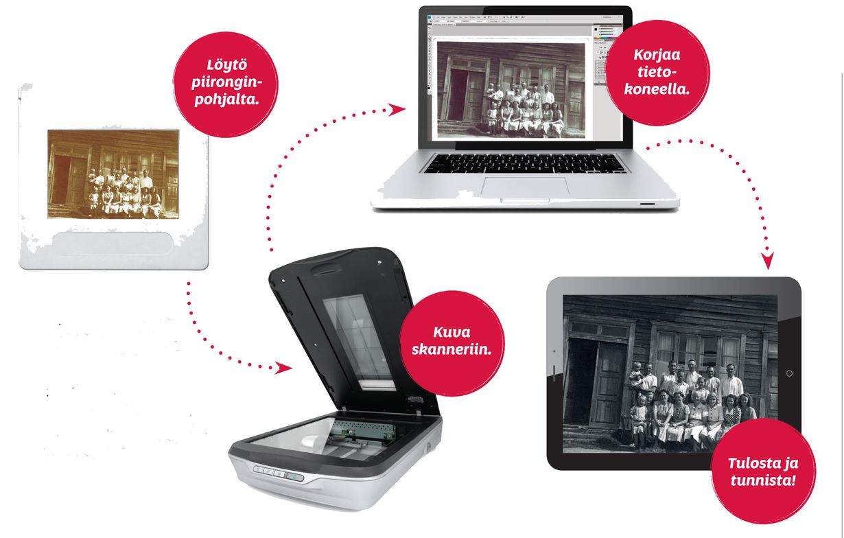 Vanhat valokuvat saa siirrettyä digitaalisiksi kuvatiedostoiksi skannerilla eli kuvanlukijalla. Noin 100 euron laite tekee hyvää jälkeä eikä työnkulku ole mutkikas.