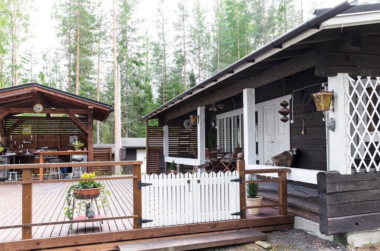 Arja ja Raimo Saari viettävät kesät mökillä, jonka hirret ovat yli kaksisataa vuotta vanhoja. Uusi saunamökki on Ville-pojan käsin veistämä. Katso kuvat kauniista mökistä!