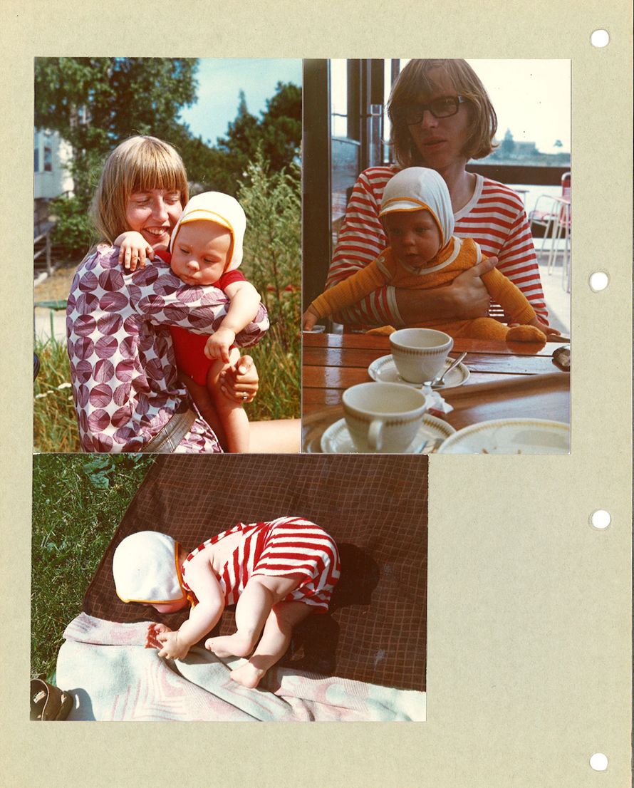 – Piirsin vain housut kankaalle vanhojen mukaan, ei minulla mitään kaavoja ollut. Ompelin Sakulle paljon marivaatteita, sillä tilkkuja myytiin silloin Marimekon liikkeissä edullisesti. Lippahattuja tein paljon, vauvallakin piti olla omansa.