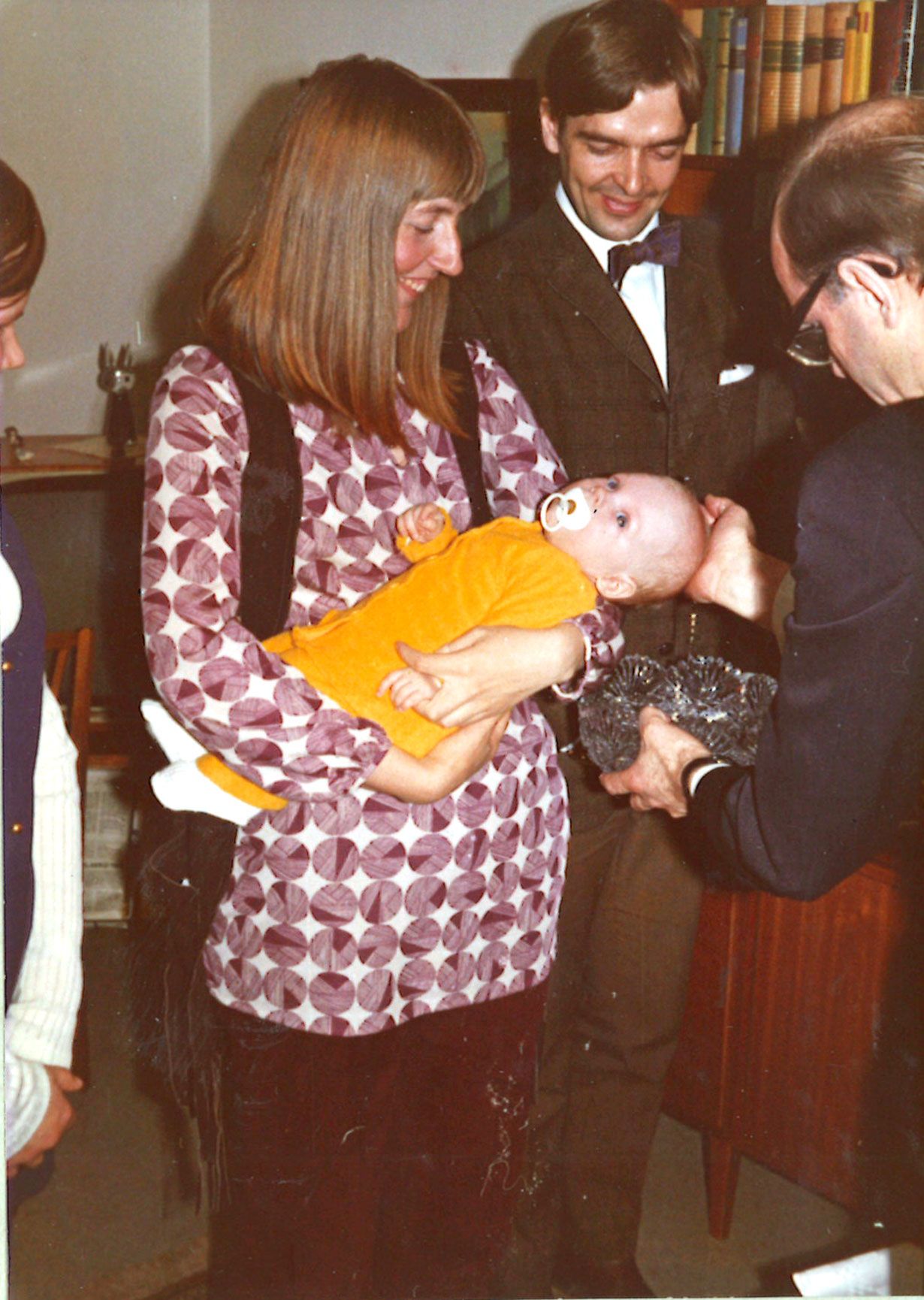– Jouduin tekemään käsityöopettajaksi opiskellessani oikean ristiäismekon. Mutta minäpä tein Sakulle keltaisen leveälahkeiset housut ja isonappisen takin, jossa on poolokauluskin! Vähän sukulaiset katsoivat, että onpa erikoinen.