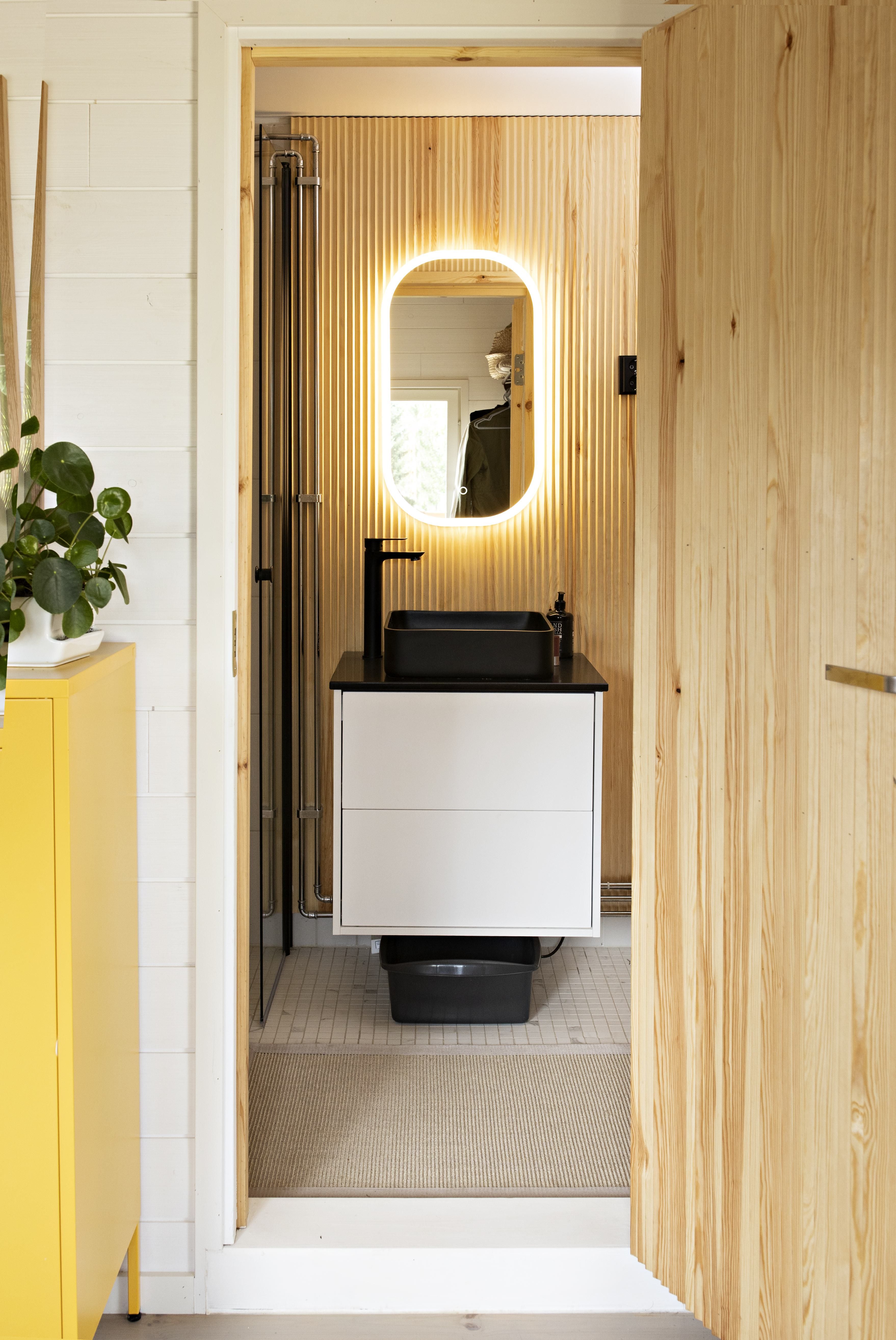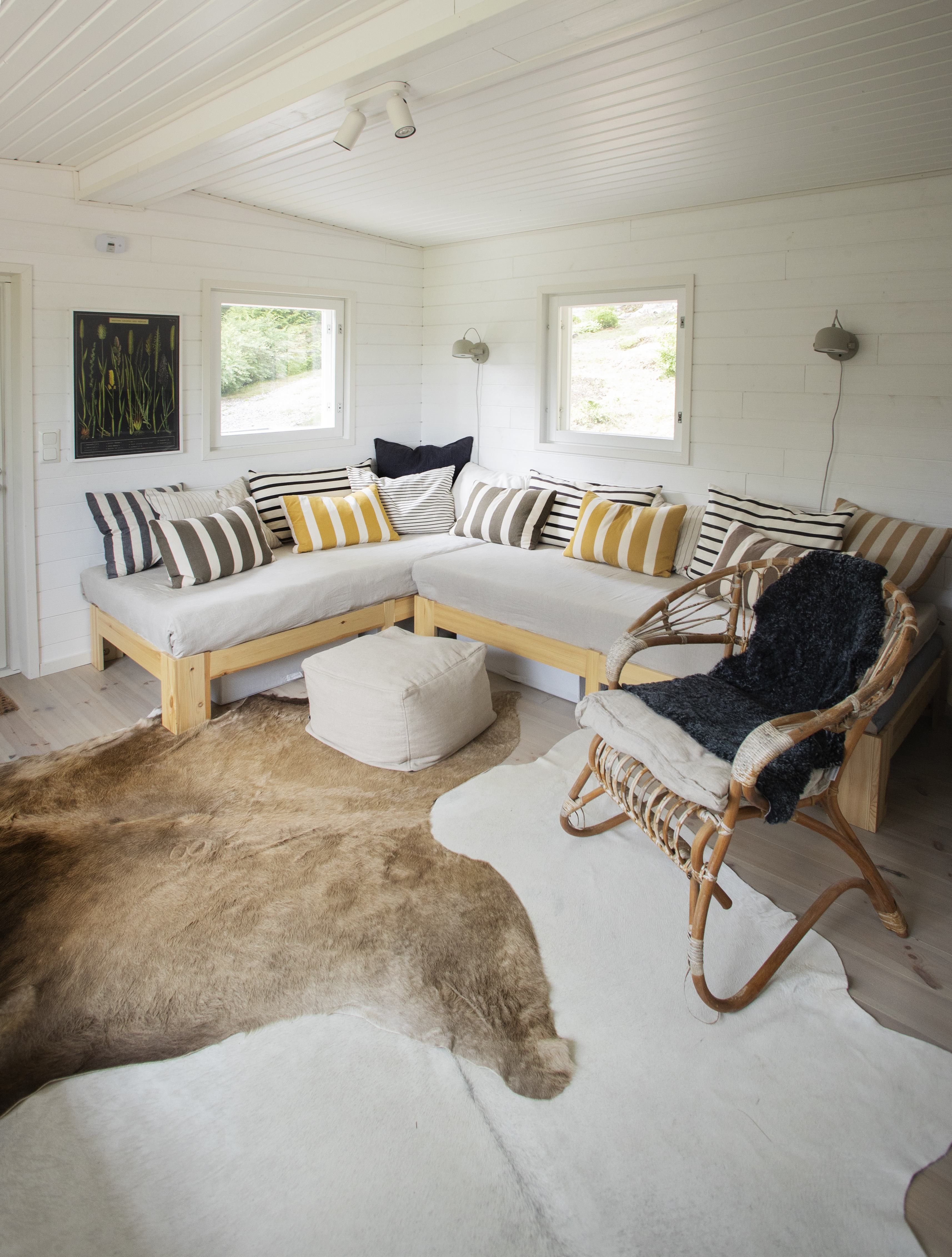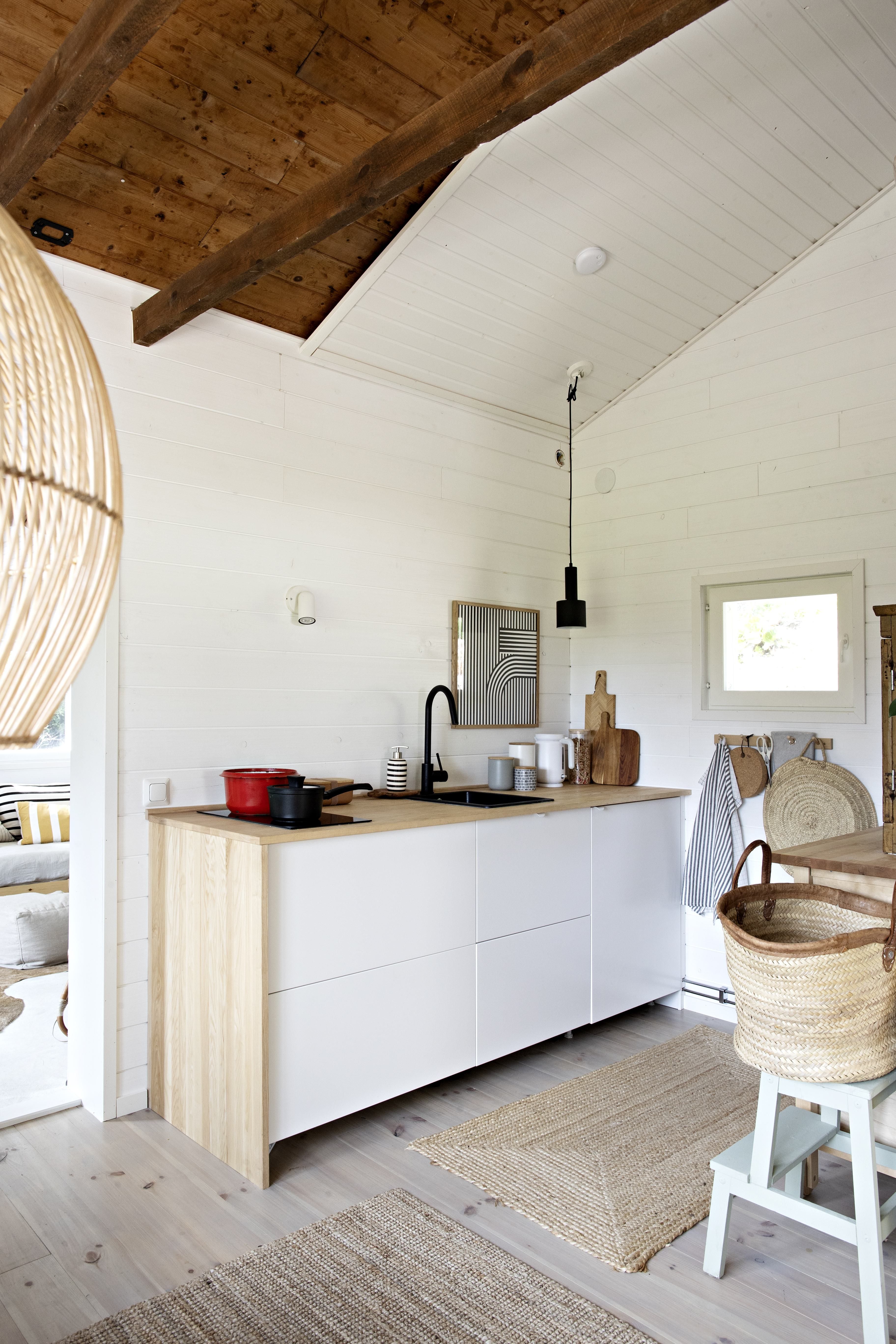 Halusin valkoista, mutta en kliinistä. Siksi valitsin valkoisen rinnalle lämpimiä puun sävyjä. Halusin mökille myös väriä, koska kotini on mustavalkoinen.