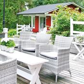 - Olohuoneessa riittävän suuri matto kokoaa oleskeluryhmän yhtenäiseksi.