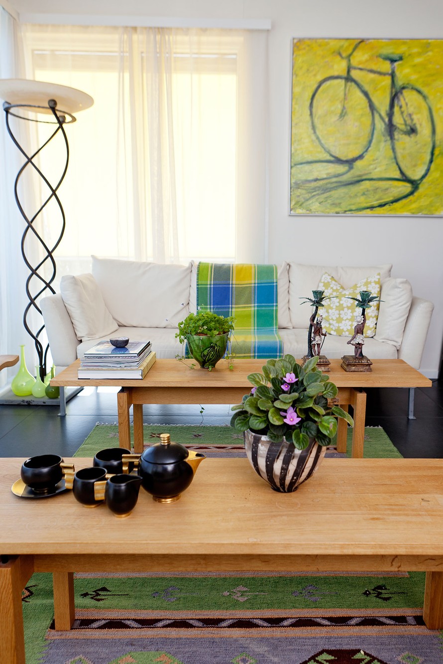 – Minulle on hyvin tärkeää, mitä ympärilläni on ja miltä kotini näyttää. Se tuo minulle valtavasti iloa arjessa. En tietoisesti mieti sisustusta, ja se vähän vaihtuukin koko ajan. Perusväri on norsunluu, joka toimii hyvin taiteen kanssa. Maustan sitä lempivärilläni limellä.