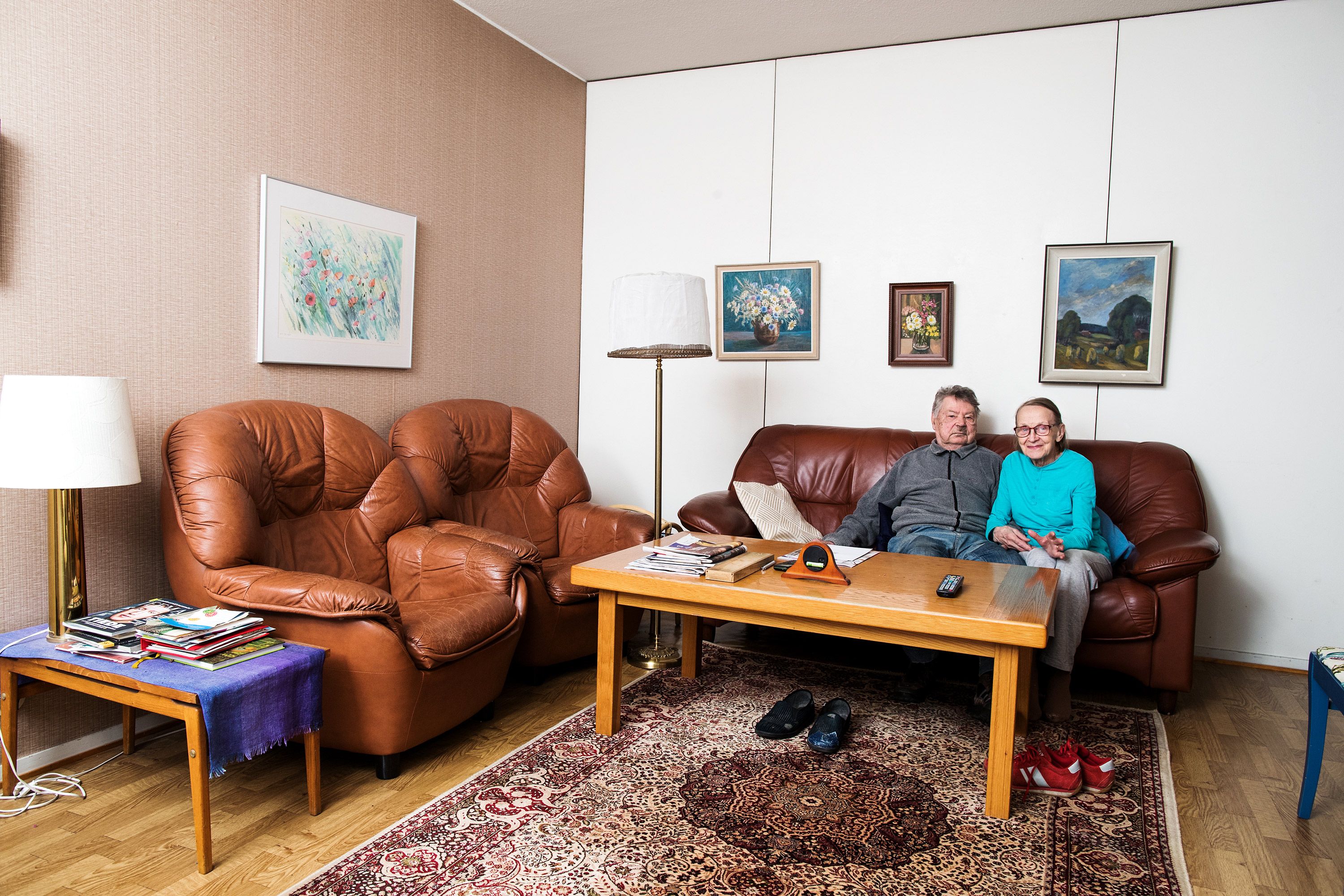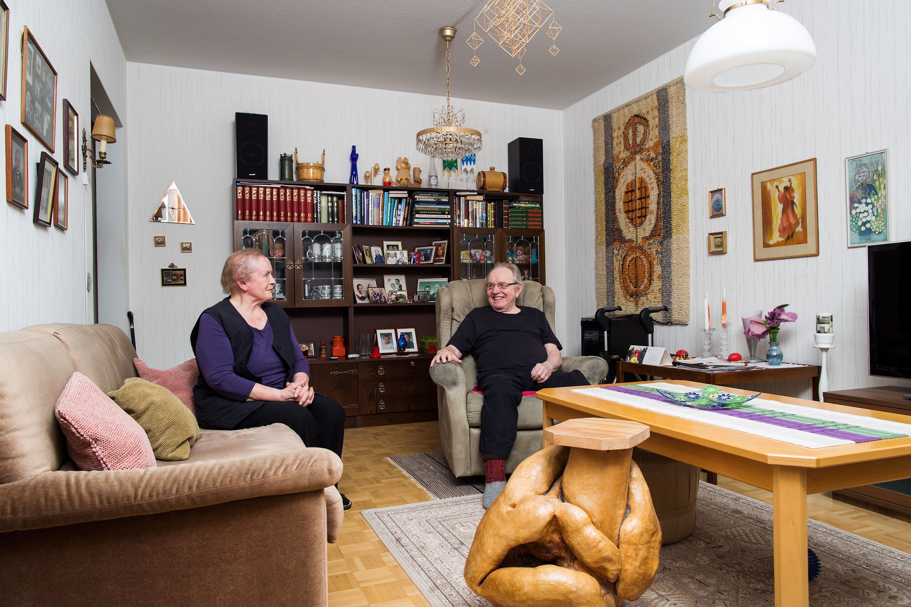Eeva, 79, ja Tauno, 80, Sneckin kotona on 50 asumisvuoden aikana ehditty tehdä parikin remonttia, mutta moni tavara on pysynyt kyydissä. Kinnulan kirkkoa kuvaava taulu muistuttaa Taunon kotiseudusta. Komea pahka on Eevan lapsuudenmaisemista Puolangalta Kainuusta.