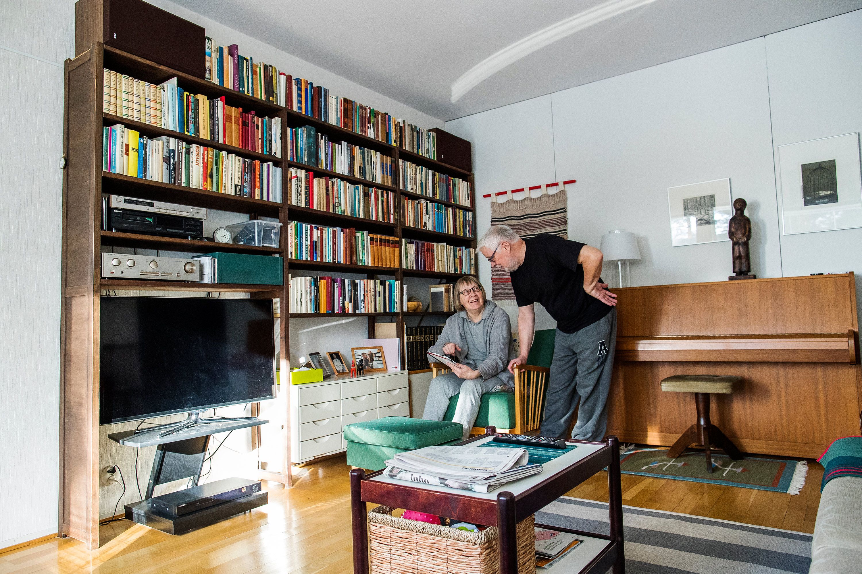 Tauno istuu mielellään keinuvassa nojatuolissa, jonka asentoa voi vaihdella ja lukita mieleisekseen. Eeva viihtyy paremmin keinutuolissa lukemassa tai televisiota katsomassa.