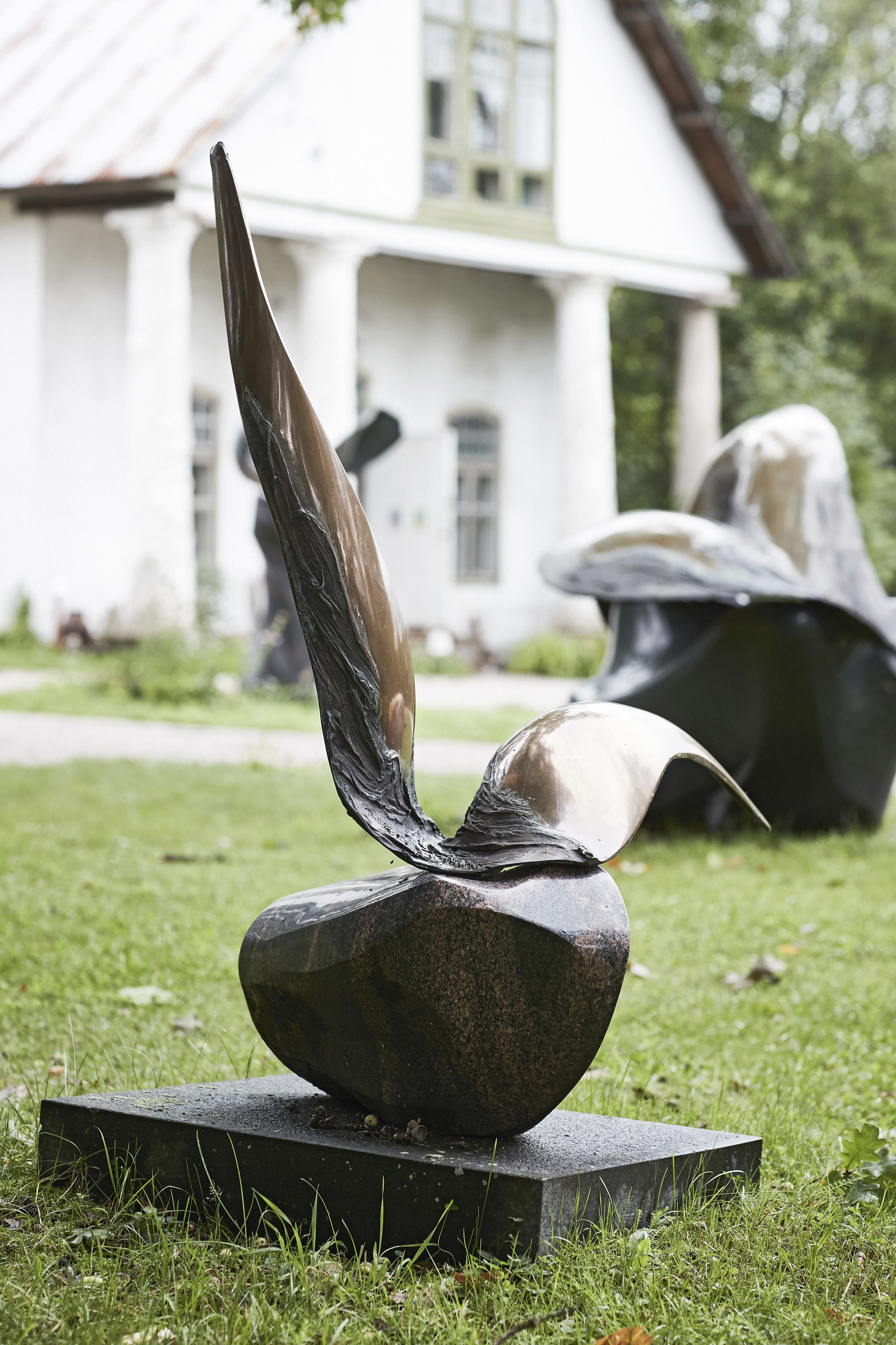 Kuvittelen itsekseni, että näitä varmaan Lailakin tutkiskeli päivästä toiseen. Ja kuinka ollakaan, kun pääsen kartanon pihaan, näen saman muodon veistettynä kivestä. Teos kurottaa korkeuksiin, vaikka on raskaasti maassa kiinni.