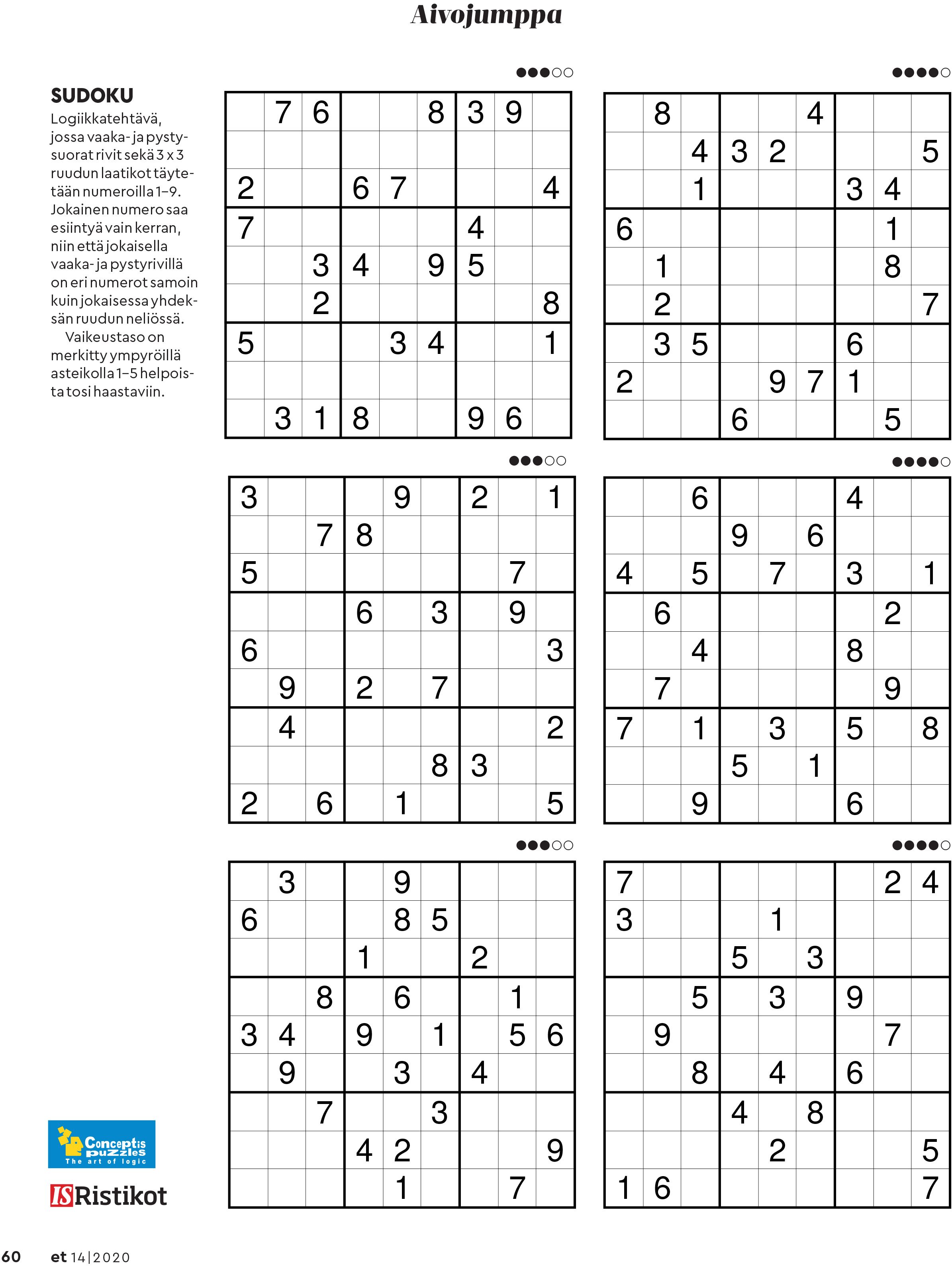 Tässä sudokusivu sellaisena kuin sen lehdessä piti olla. Vastaukset tehtäviin löydät ko. numeron sivulta 65.