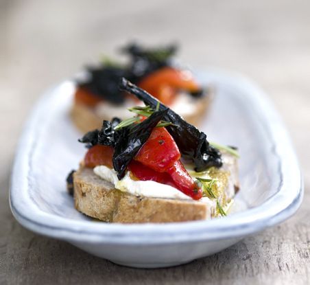Paahda leipäviipaleet uunissa tai paahtimessa. Sipaise leivän pintaan kevyesti oliiviöljyä ja maustamatonta tuorejuustoa. Levitä pinnalle paprikat ja sienet.