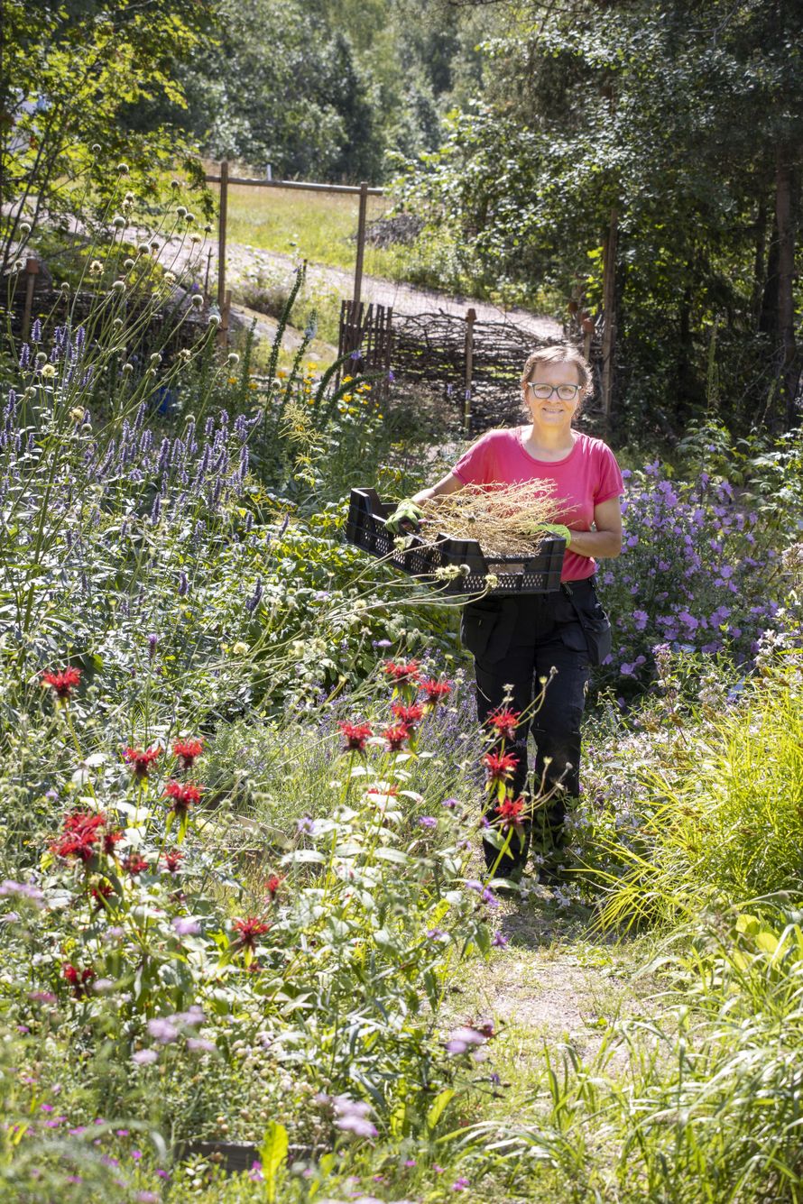 Aurinko puikahtaa piiloon taivaalla lipuvan poutapilven taakse. Samassa silmänräpäyksessä katoavat kaikki valkoiset lanttuperhoset ja muutama punasävyinen nokkosperhonen, jotka vielä hetki sitten liihottelivat Erja Hinkkasen, 62, kasvattamien piikkiputkien, auringontähtien, väriminttujen ja muiden perennojen kukissa.