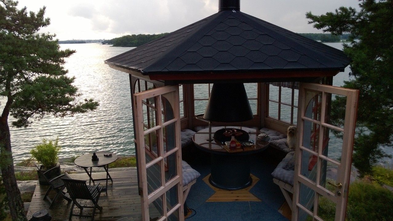 Ja tästä ei grillikatos parane! Maisemat ovat mielettömät. Grillauspaikka on rakennettu hienolle näköalapaikalle, johon viimeinenkin auringonsäde yltää. Siinä voi siemailla viiniä leppeässä kesäillassa ja katsella ohi lipuvia veneitä.